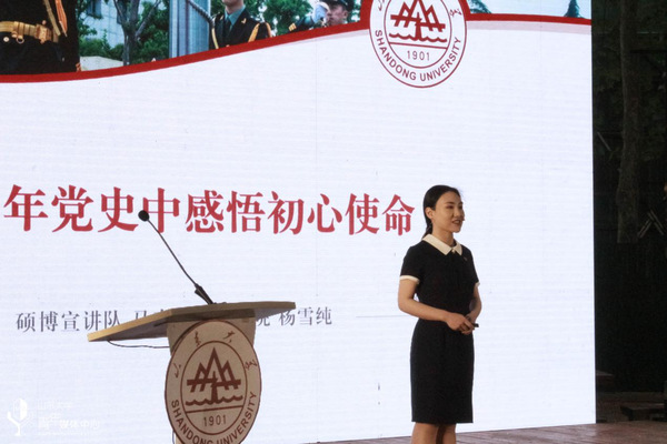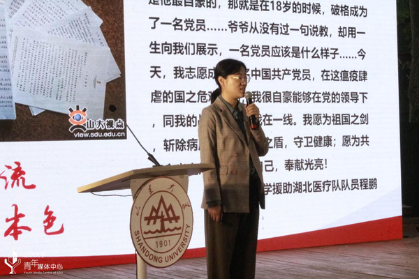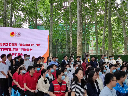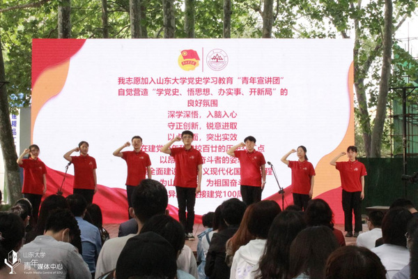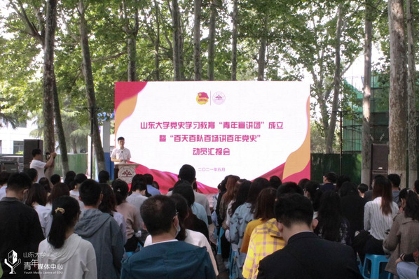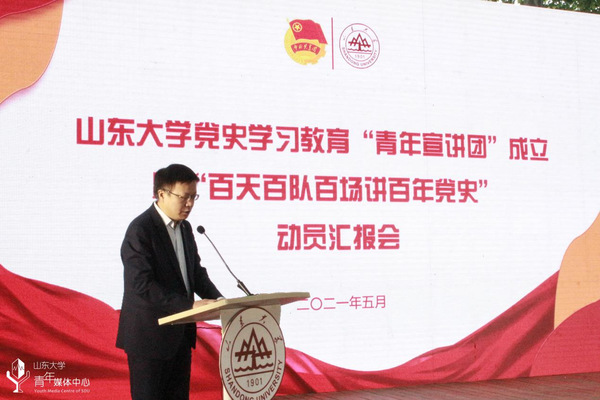 为认真学习贯彻总书记在党史学习教育动员大会上的重要讲话精神,把“四史”学习转化为育人成效,将党史知识融入青年团员教育日常,引导青年学生知史爱党、知史爱国,5月13日,山东大学党史学习教育“青年宣讲团”成立暨“百天百队百场讲百年党史”动员汇报会在中心校区小树林举行。山东大学党委副书记王君松,山东大学党委常委、宣传部(教工部)部长桑晓旻出席会议。会议由山东省青年志愿服务先进个人、山东大学十佳共青团员马文啸主持,山大青年师生代表参与活动。