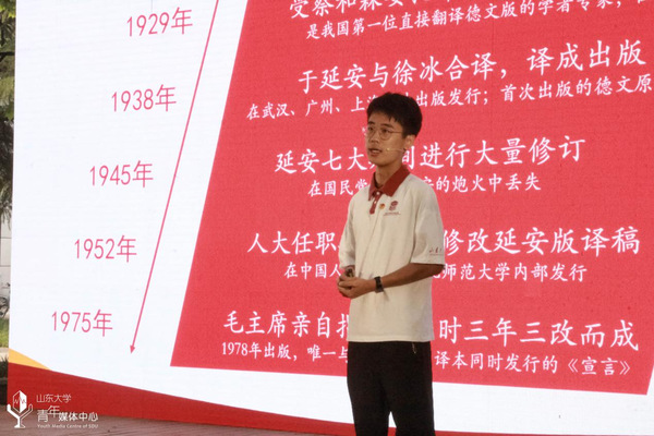 为把“四史”学习转化为育人成效,将党史知识融入青 年团员教育日常,引导青年学生知史爱党、知史爱国,以昂扬青年奋斗者姿态迎接全面建设社会主义现代化国家新征程,由校团委主办、经济学院团委承办,组建山东大学党史学习教育“青年宣讲团”并开展“百天百队百场讲百年党史”宣讲活动,成立青年菁英宣讲团、青年志愿者宣讲团、青年“轻骑兵”宣讲团,并与教师工作部共同成立青年教师宣讲团,涵盖青年教师、硕博研究生、各志愿服务团队、团校学员、各学生组织及学生理论社团等多个“轻骑兵”团队,面向全校团员青年开展宣讲活动。