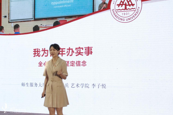 在动员汇报环节,“青年教师宣讲团”成员邱瑶,“青马特色班宣讲轻骑兵”成员、全国五四红旗团支部成仿吾英才班团支部成员周冠辰、邵点,“硕博宣讲队”成员杨雪纯,“师生服务大厅宣讲轻骑兵”成员、山东大学师生服务大厅志愿者、学生会“权小益工作室”代表李子悦,“团校学员宣讲队”成员王伯骏,研究生支教团成员吴航结合个人事迹,从制度优势、党员引领、党史进程、服务工作、长征精神、山大担当各个维度系统性地向大家展现了中国共产党初心蕴藏的强国密码和丰厚的时代内涵,并鼓励广大青年学子学习身边的党员模范,从自身出发传承红色基因,当好党的预备队和后备军。