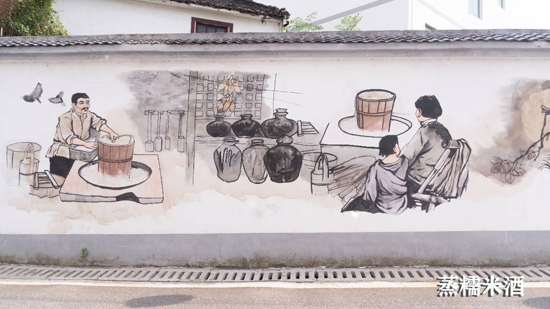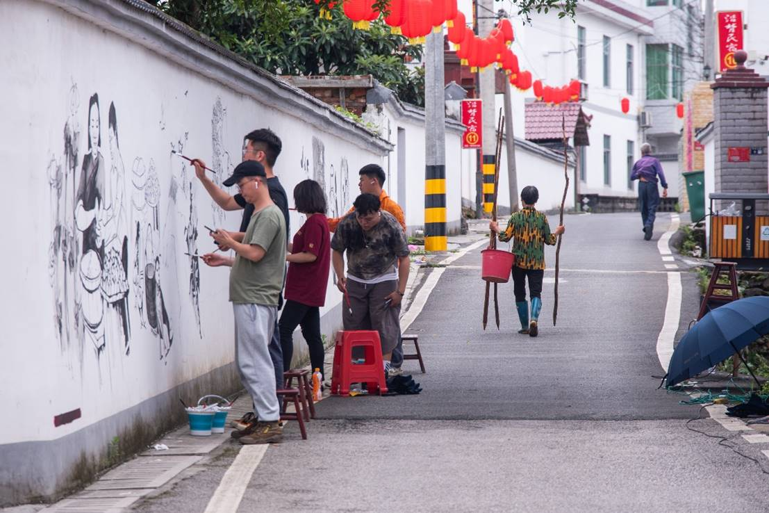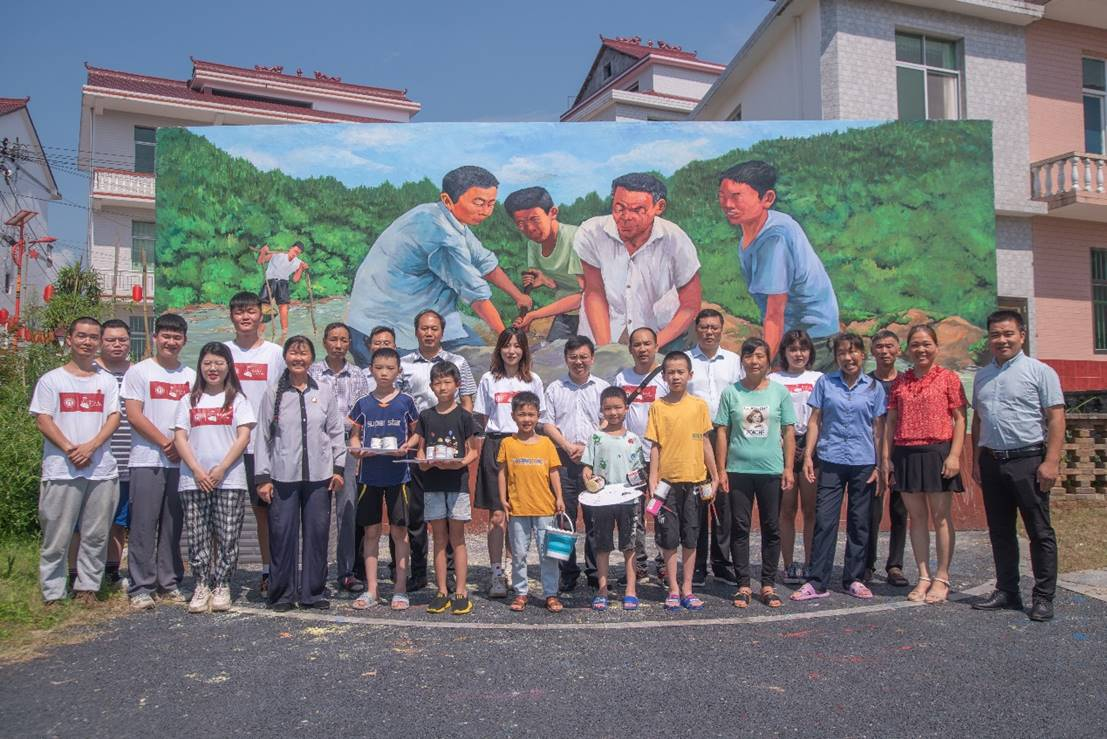 团队成员们在沿背村甘祖昌干部学院开展墙绘创作