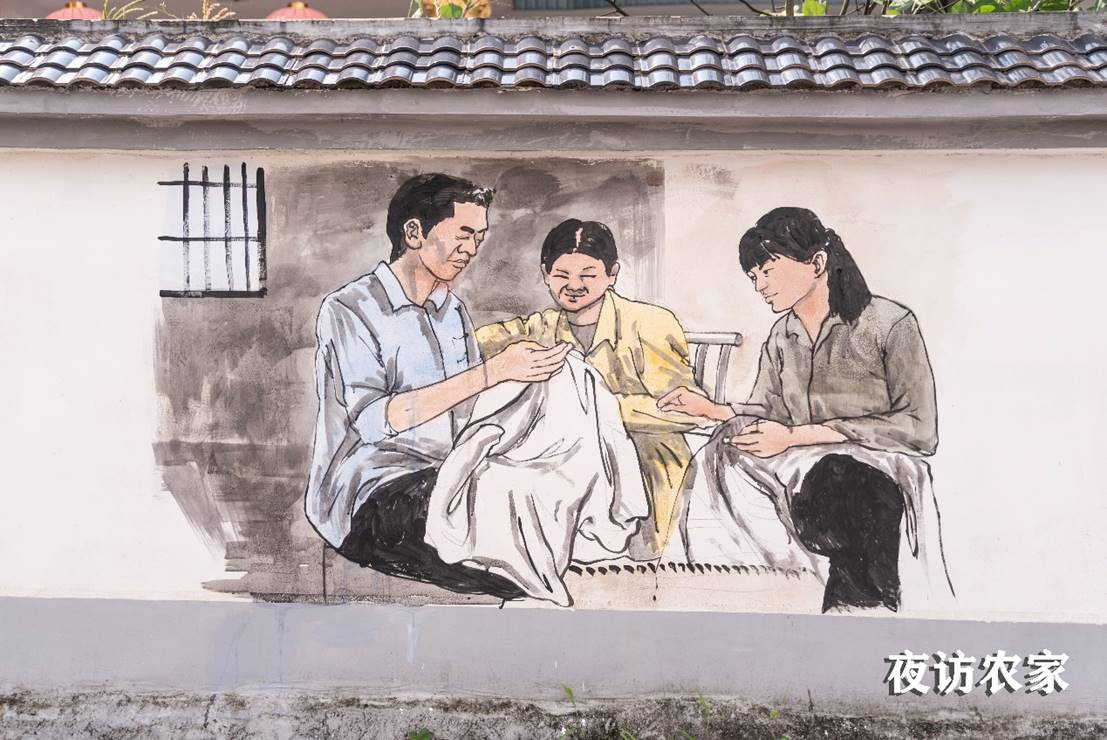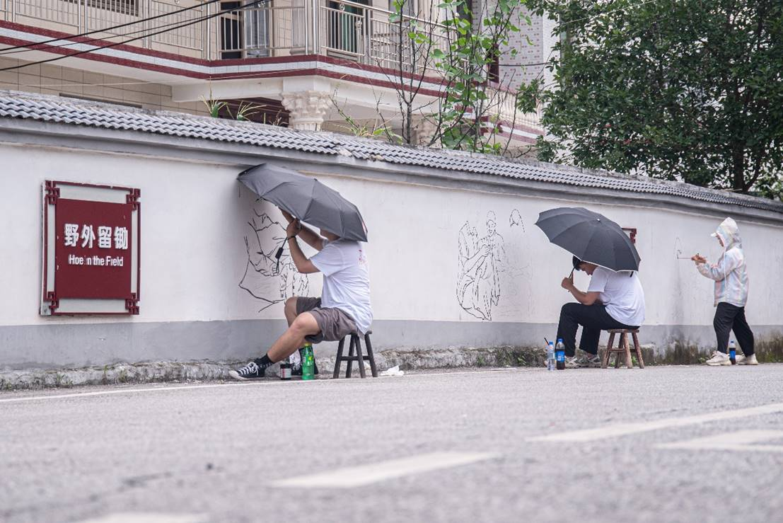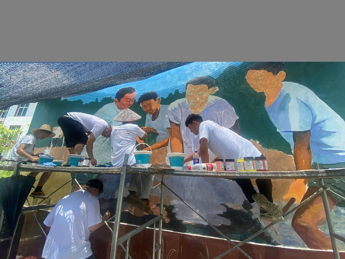 在这样酷暑的季节,队员们白天要预防高温中暑,夜晚要防止蚊虫叮咬,创作过程中遇到的问题一个个接踵而来。正当队员们苦恼时,村民们看到队员们连夜辛苦创作,纷纷伸出援手。夜晚没有电源,就接来插线板,从村民们自家接电;临时没有架子,村民就抬出长板凳,一个一个的拼接起来;温度太高,村民把家里的电风扇搬了出来;蚊虫太多,主动给队员们涂抹上驱蚊水;队员中暑,还请来了村医为队员们提供了后勤保障。东家的蚊香、西家的风扇、村口的排插、村尾的西瓜,沿背村淳朴的民风感动了在场的每一位队员,大家心中默默许诺,排除万难也要保质保量完成此次的墙绘工作。