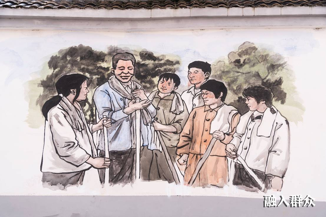 在墙绘创作的过程中,我们有幸遇见了曾见过甘祖昌将军本人的几位老奶奶。其中一位自称为甘将军的孙女,一直生活在村子里。据她所述,当时小时候住在故居里的生活非常艰苦,白天要下地去插秧,晚上学习。曾和爷爷闹过脾气,但这一切在懂事后慢慢消失,时常听爷爷倾述革命精神、为人民服务的坚定信仰,这成了她长大成人的前进动力。今天,看到了队员们创作的一幅幅画面再次还原了当年的场景时,和爷爷过往的故事又浮上了心头。