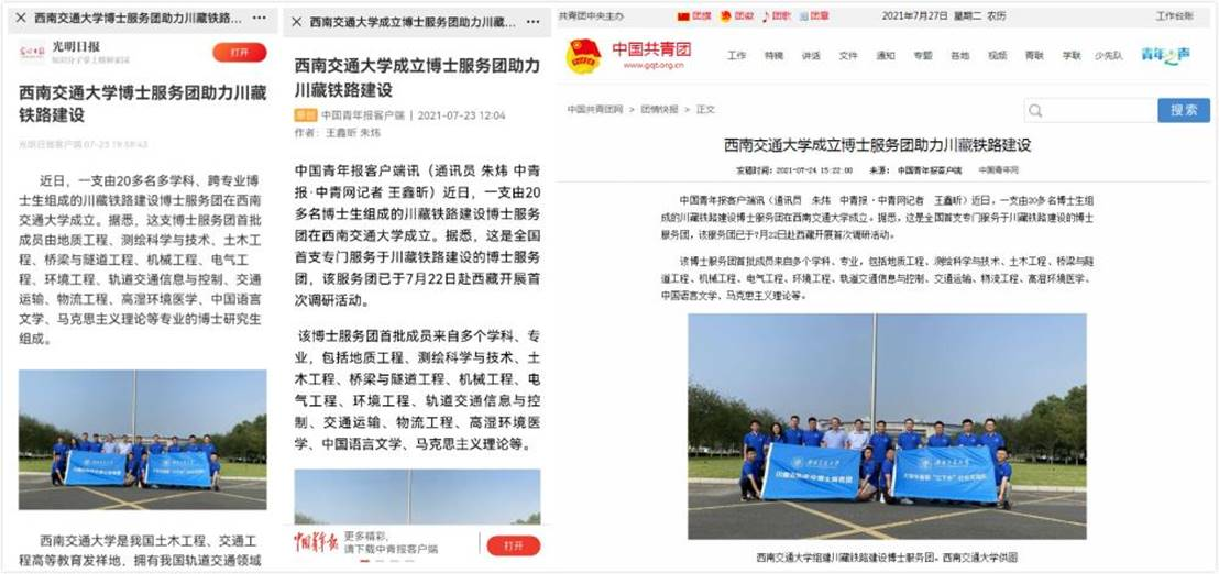据悉,该博士服务团为学校庆祝中国共产党成立100周年专项社会实践项目,并已被共青团中央立项为2021年暑期社会实践全国重点项目。本次赴西藏开展实践服务期间,走访了西藏地勘局、交通勘察设计院,拜访了部分校友和川藏铁路建设相关领域专家,并就环境地质勘查、高温地热等问题请教地质学专家多吉院士。走进中铁一院、中铁二局、中铁隧道局、水电十四局等川藏铁路建设项目指挥部,以及色季拉山隧道、波密段工程等地开展调研交流、现场勘察、理论宣讲。实践服务活动还受到了光明日报、中国青年报、新华社、中国青年网、中华网、中华铁道网、四川新闻网、四川发布、封面新闻、成都商报等主流媒体的关注报道,取得了积极的社会影响和良好的育人实效。