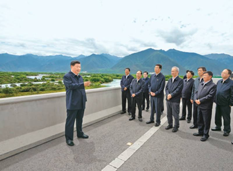 2021年7月21日上午,习近平在林芝尼洋河大桥考察雅尼湿地。