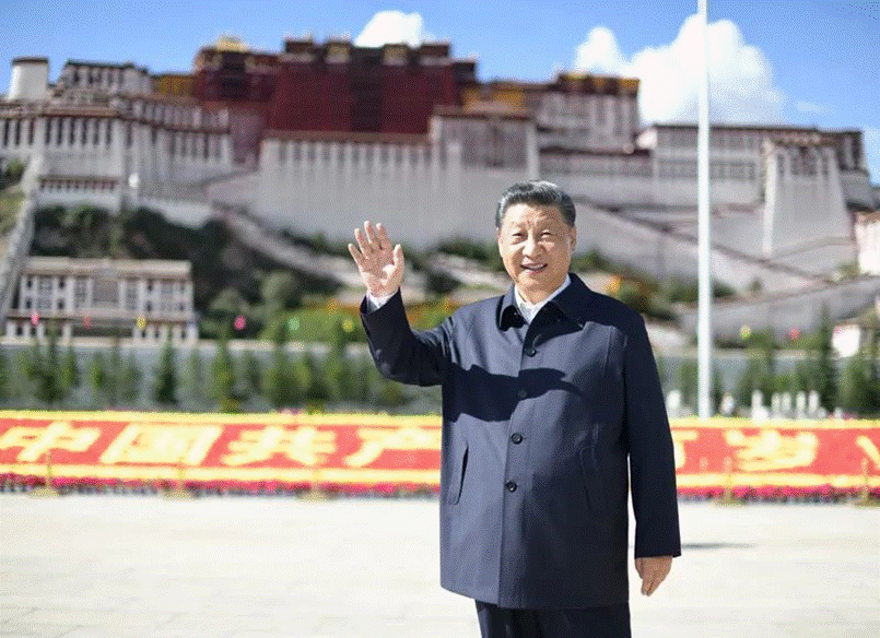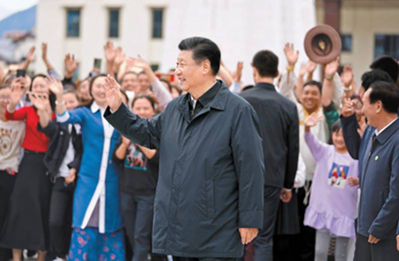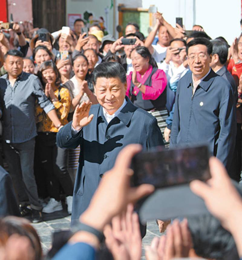 2021年7月22日下午,习近平在考察位于拉萨市老城区的八廓街时,向各族群众挥手致意。