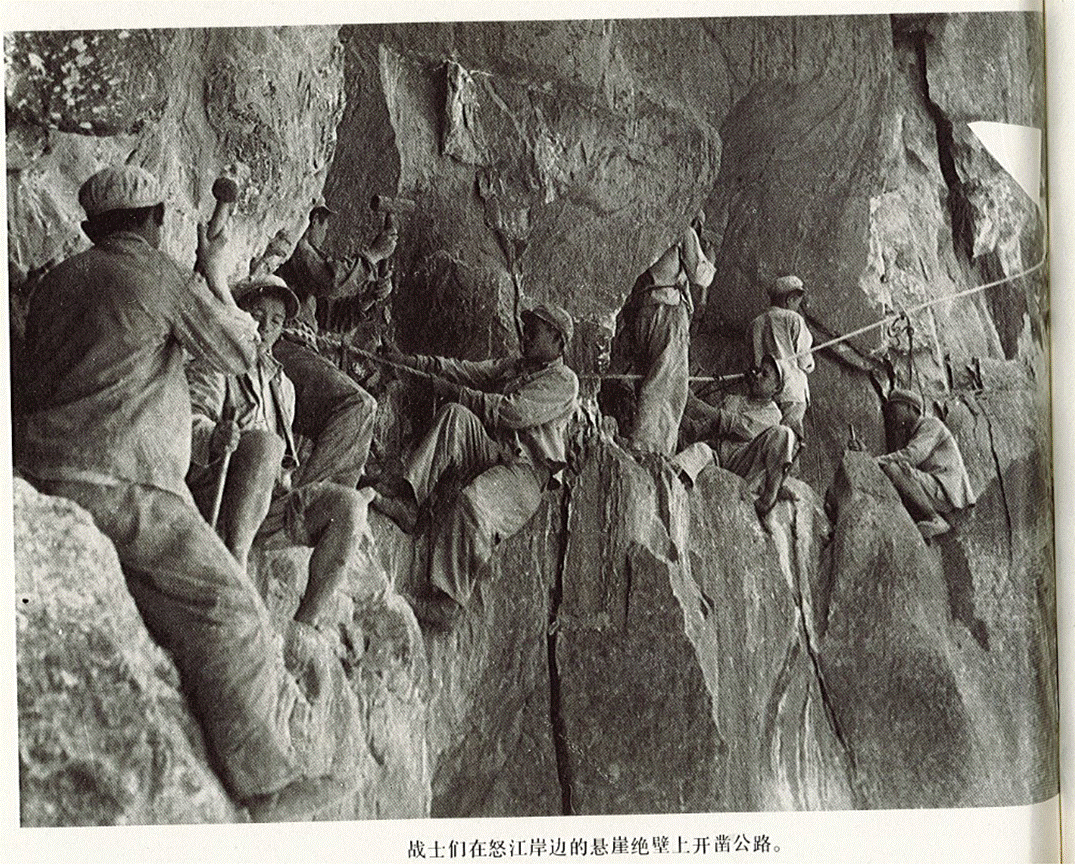 上世纪50年代,战士们在怒江岸边的悬崖绝壁上开凿公路