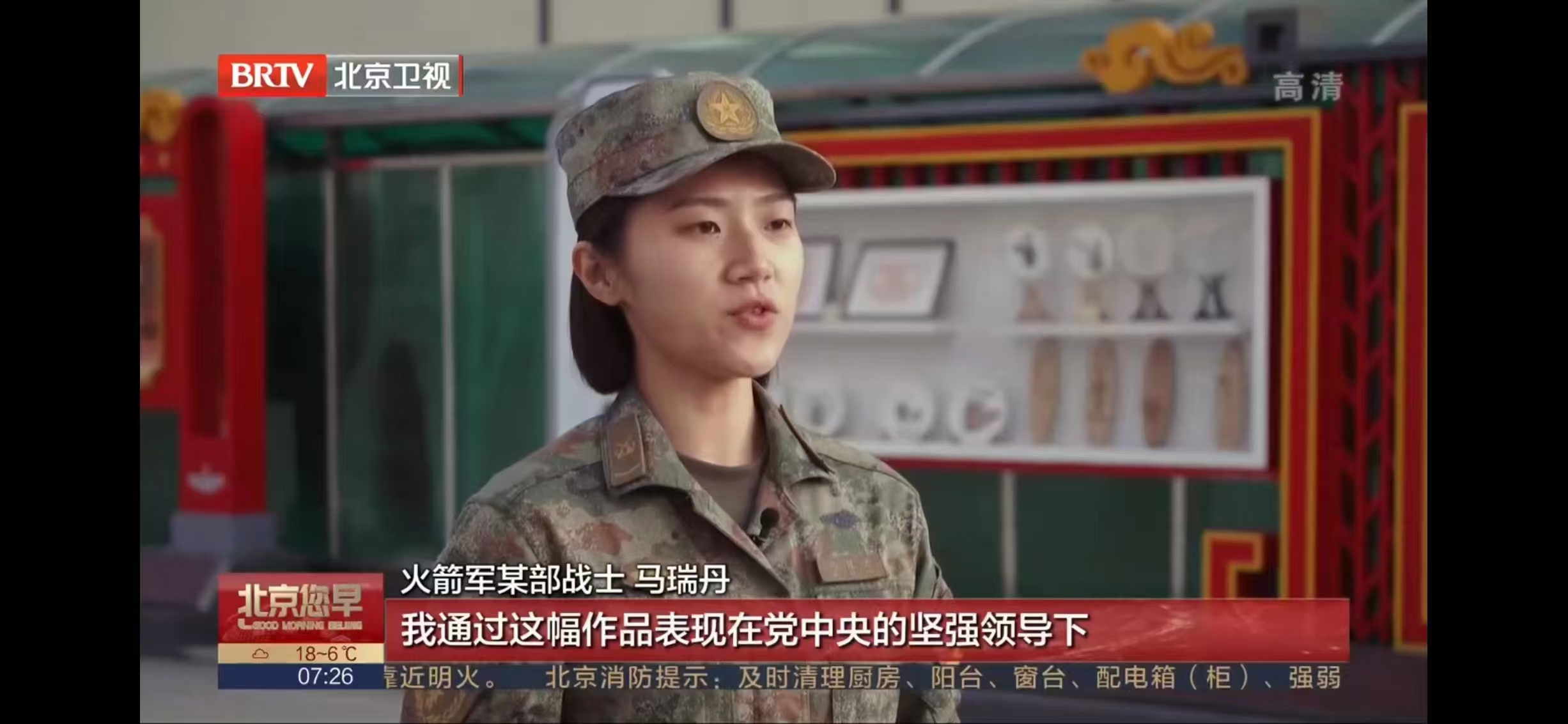 用“多点开花”来形容马瑞丹的军旅生活应该非常贴切。她连续三年承担连队八一文化节作品创作工作,她把对部队的热爱用文艺作品一点点地记录下来,她的个人作品“电烙画-红船”入选火箭军网上书画展,电烙画“女战斗员”、雕塑小稿“通信战士”和多幅掐丝珐琅作品入选正军级单位“倚天书画展”;2023年7月参加“火箭军第三届基层书画骨干培训”获得优秀学员;2023年8月借调旅级单位进行文化创作帮带,并代表单位被北京卫视“北京您早”栏目报道。