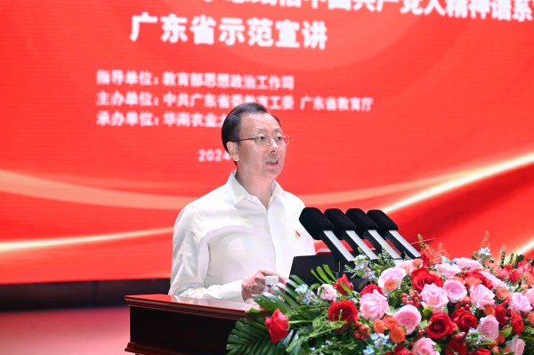 9月27日下午,由教育部思想政治工作司指导,中共广东省委教育工委、广东省教育厅主办,华南农业大学承办的全国高校“传承红色基因、学思践悟中国共产党人精神谱系”广东省示范宣讲活动在华南农业大学丁颖礼堂举行,来自教育部全国高校“中国共产党人精神谱系”宣讲团的5名专家开展示范宣讲,在穗高校师生代表近800人现场聆听宣讲。教育部思想政治工作司宣教处副处级干部李丽鹏,广东省教育厅二级巡视员陈健生,华南农业大学党委书记李凤亮出席活动。华南农业大学党委副书记丁红星主持活动。