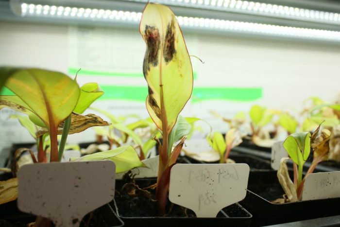 香蕉,作为一种广受欢迎的热带水果,其独特魅力在于其三倍体遗传特性所带来的无籽、甜美与软糯口感,但三倍体使得香蕉无法通过传统的有性繁殖方式繁衍后代,进而导致了其遗传多样性的显著降低,香蕉在面对病害侵袭时极易遭受毁灭性打击。同时,热科院的研究目光也投向了香蕉抗病的亲戚——大蕉,学名为芭蕉,其果实体型更为硕大,果皮坚硬且厚实,内部果肉紧实且甜度相对较低。在参观实验室时,王卓老师向团队介绍了目前香蕉研究的主要方向和成果。热科院香(大)蕉所的老师为解决香蕉抗病能力弱的问题而培养具有强抗病能力的香蕉,他们利用现代生物技术从大蕉基因组中挖掘抗病基因导入香蕉中。王卓老师告诉团队,他正在通过三轮病菌侵染来筛选具有抗枯萎病的香蕉植株,并通过多年种植和多次无性繁殖来判断抗病基因的遗传是否稳定。