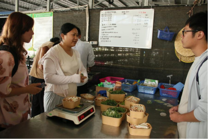 最后一站,实践团队来到了位于热带农业科学院的水蛟基地,这里是海南省冬季瓜菜种植基地,亦是科普教育的前沿阵地,承载着将南繁科研成果转化为实际生产力,以及向公众传播农业科技知识的双重使命。水蛟基地,以其独特而富有寓意的品牌——“水蛟热福芽”,在芽苗菜栽培领域独树一帜。据带队老师介绍,“水蛟”之名源自基地所处的地理坐标,即三亚市天涯区水蛟村;“热”字则取自热科院之名;“福芽”是希望能给人们带来健康的生活。带队老师也向团队展示了种植于此的绿豆芽、萝卜芽、花生芽等芽苗菜。随后,带队老师向团队分享了基地的水果莲子,与传统莲子相比,这种水果莲子口感更为甘甜,苦味显著减轻,即便是儿童也能欣然接受。