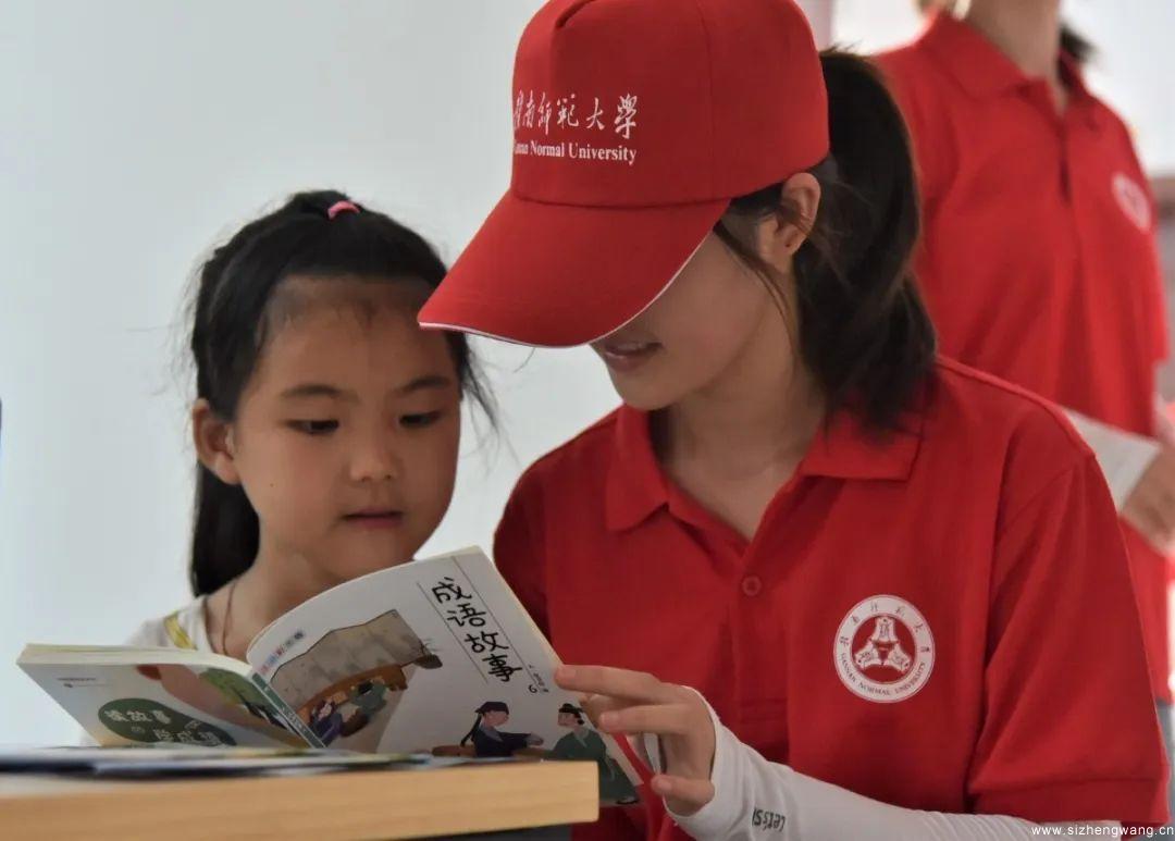 志愿者们与小朋友在书角一起遨游在书籍的海洋