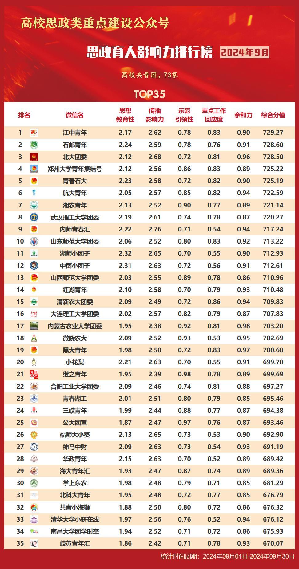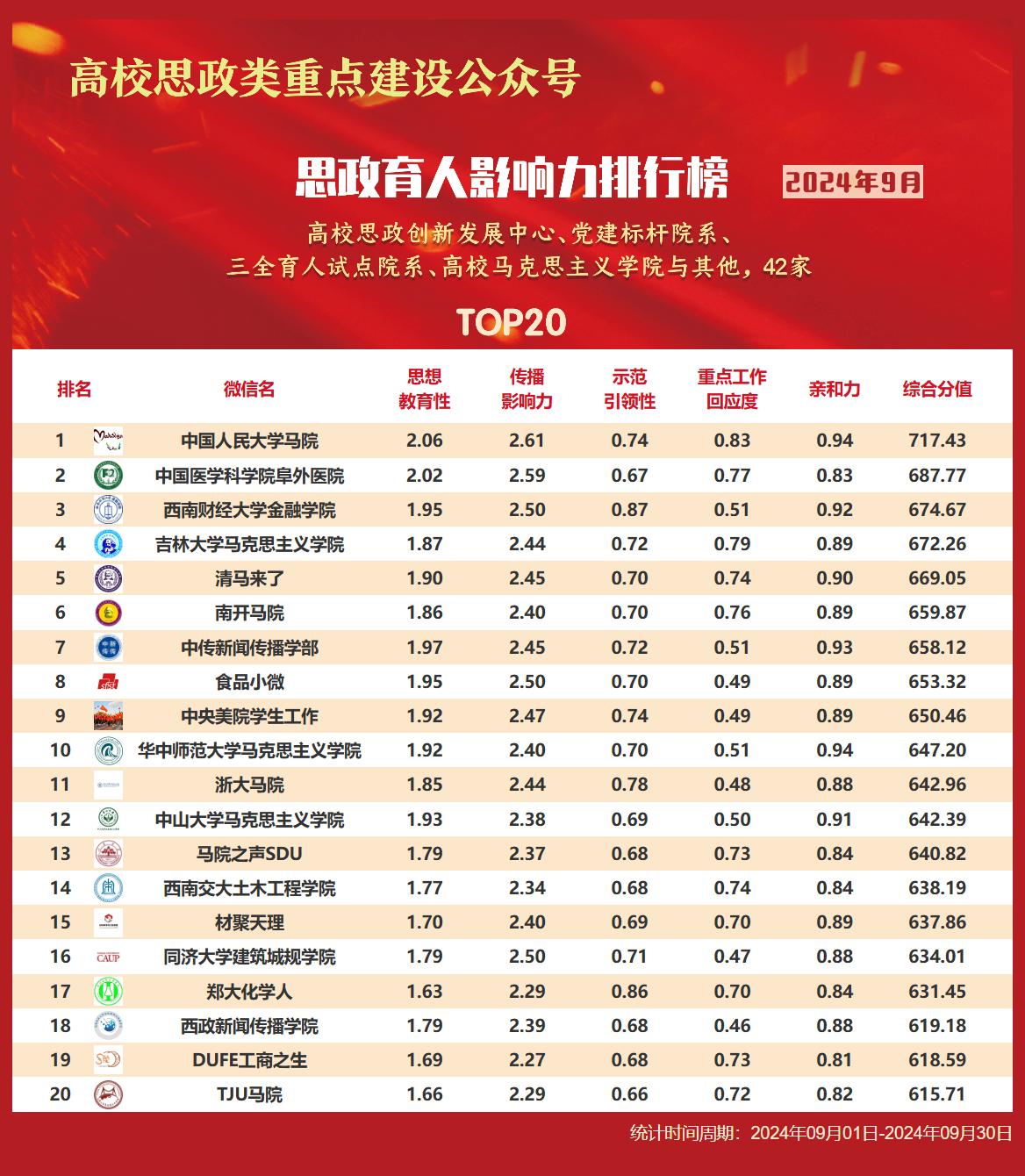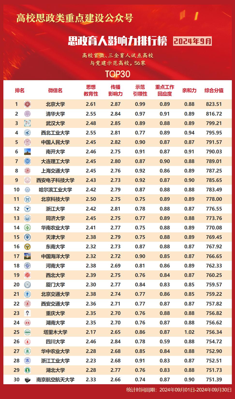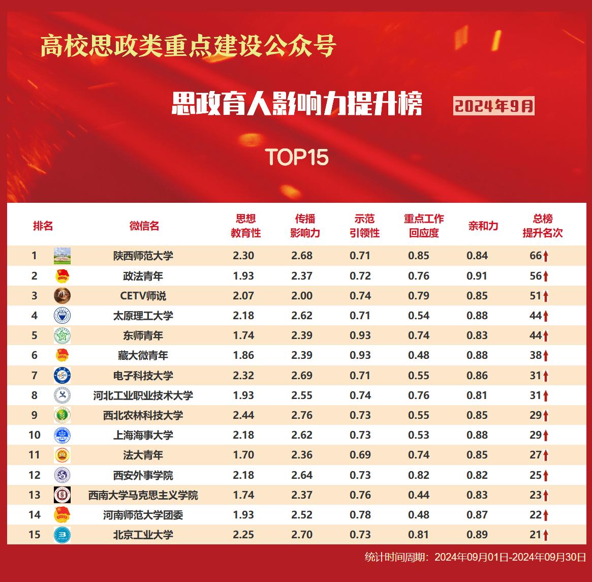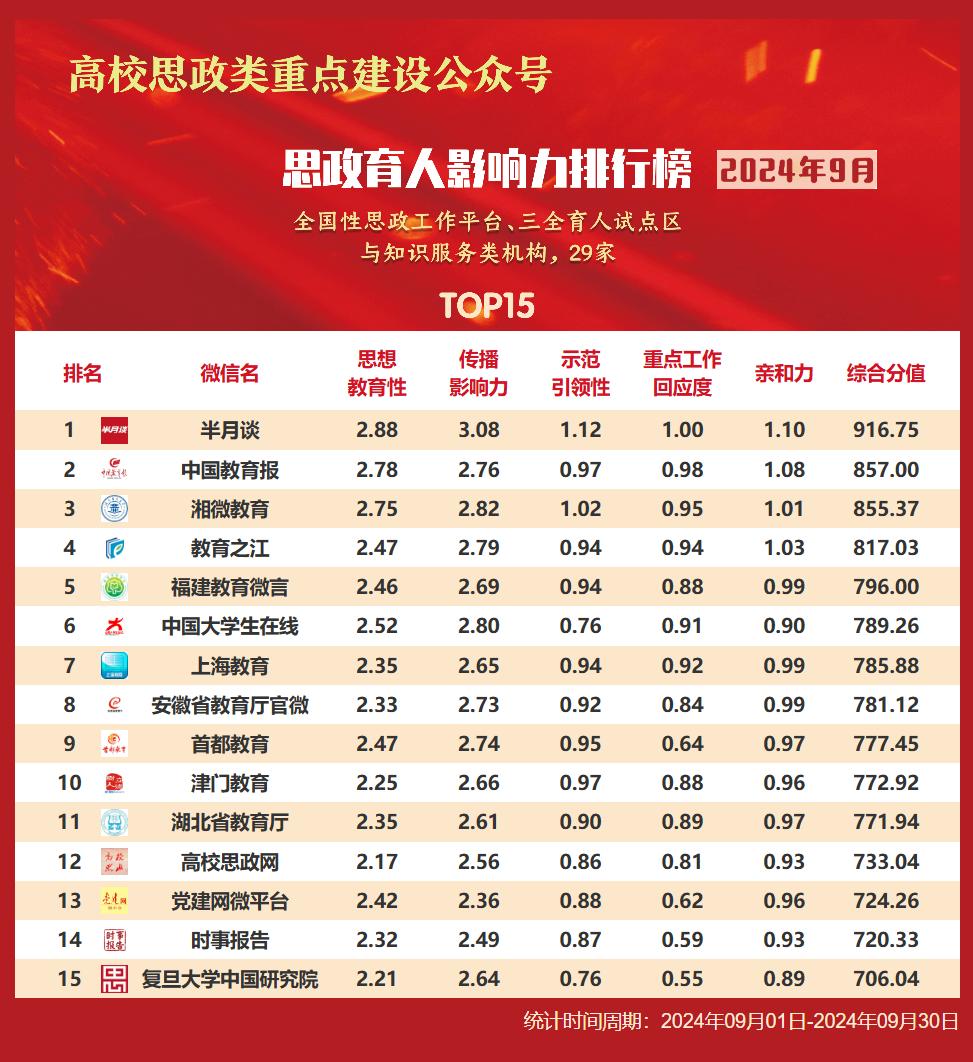 思政育人影响力排行榜、提升榜(2024年9月)