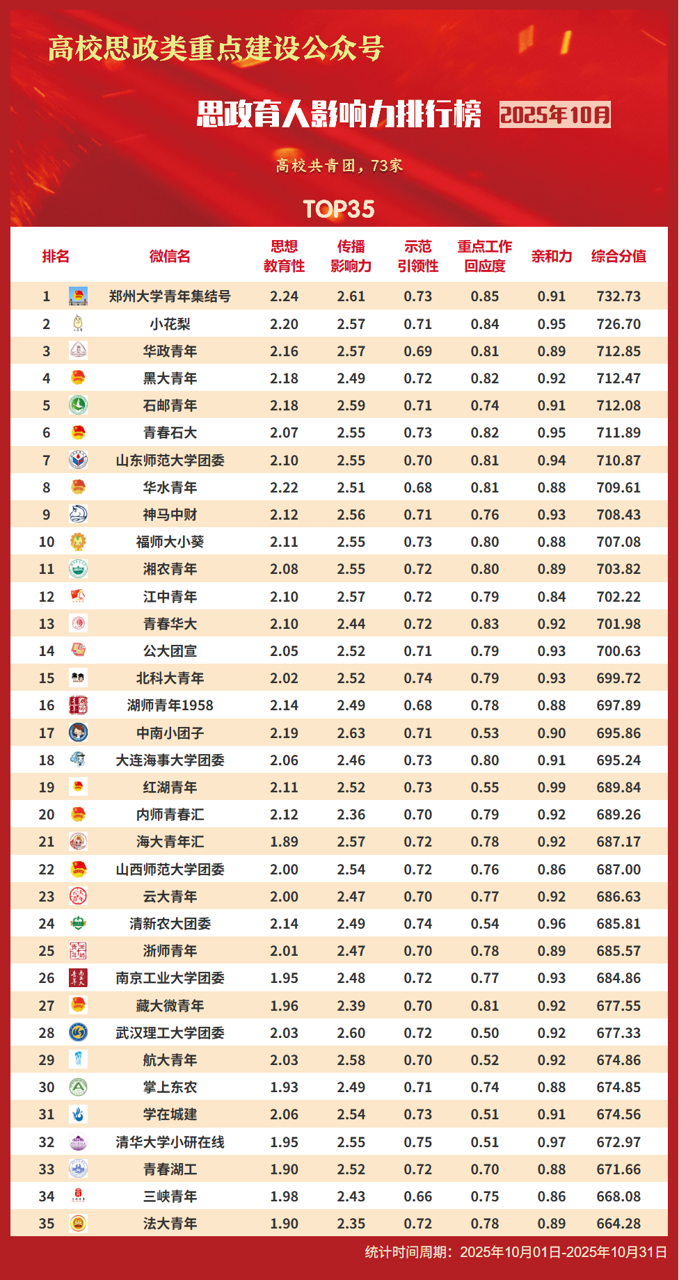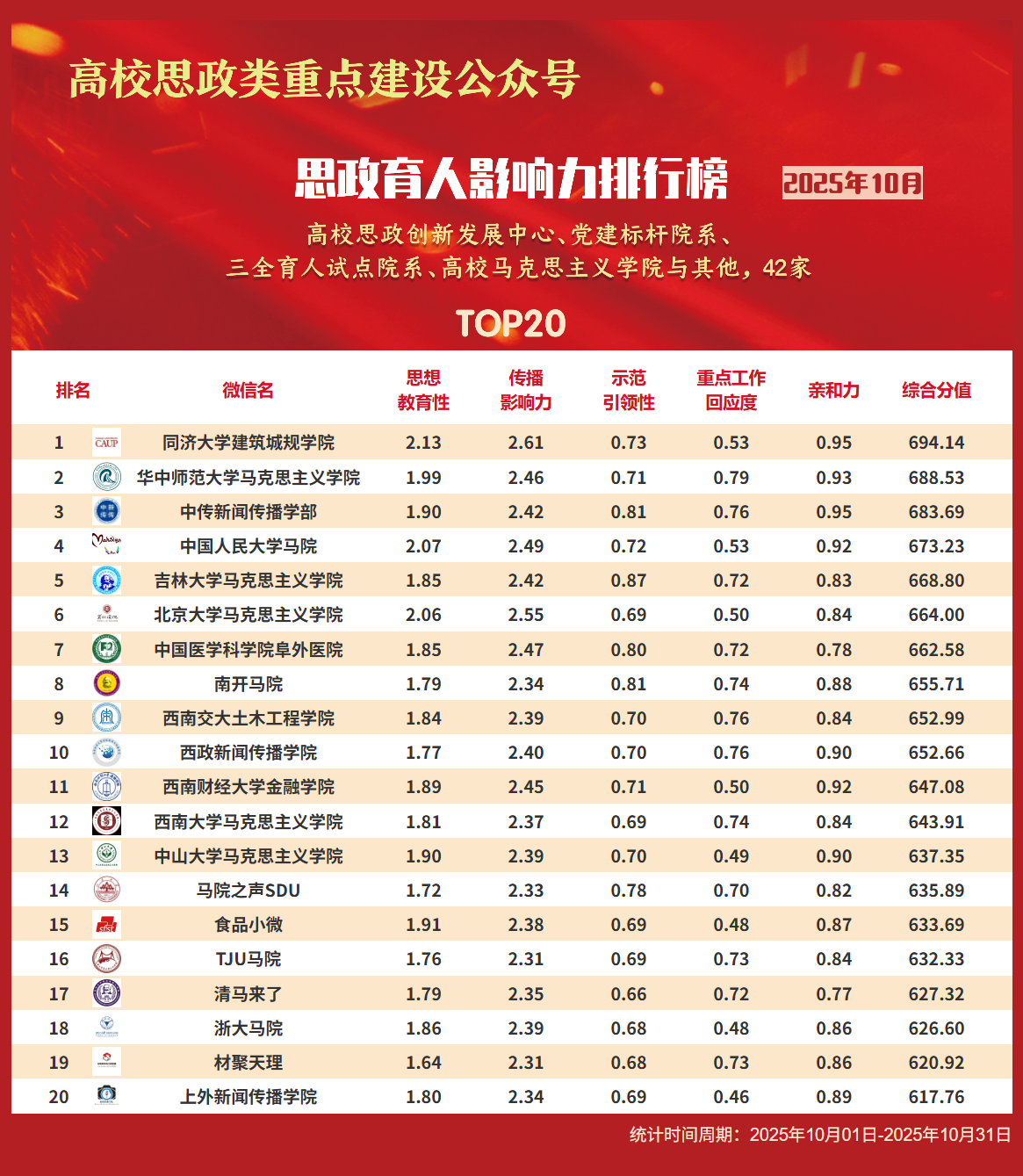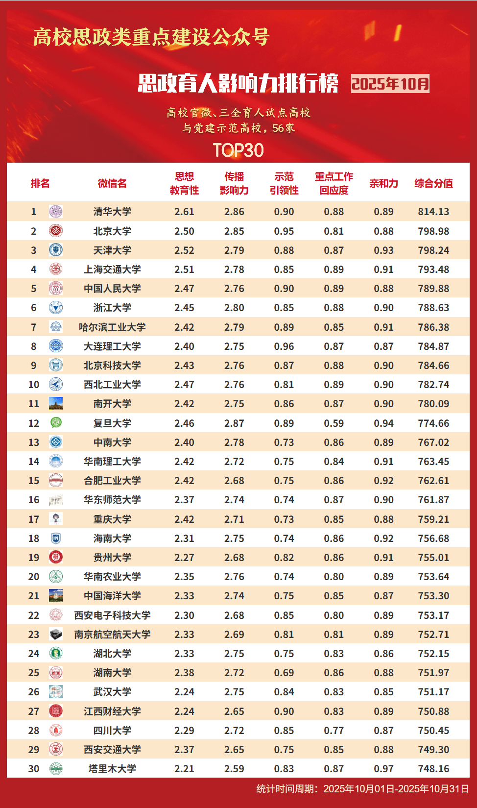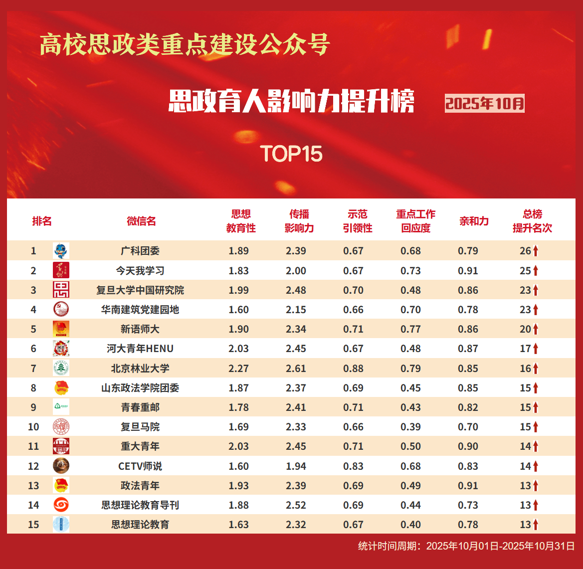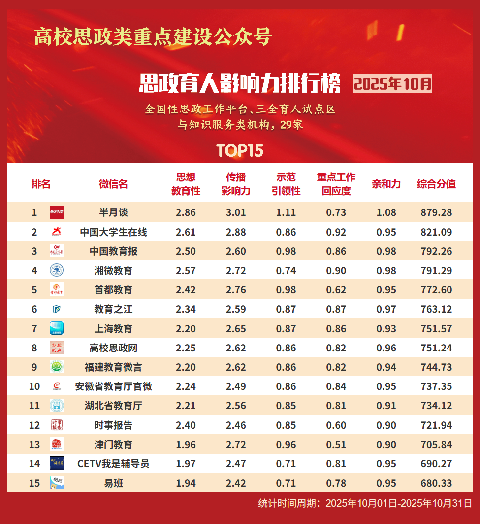 思政育人影响力排行榜、提升榜(2025年10月)