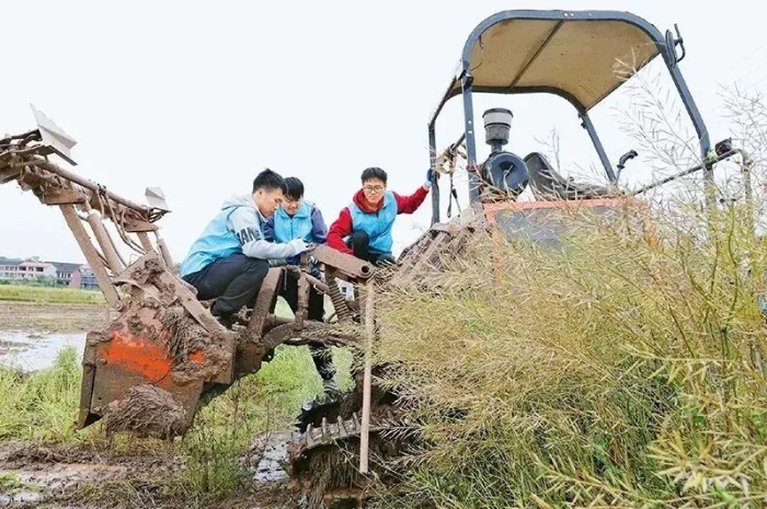 图为2023年4月29日,南华大学的大学生志愿者利用五一假期到湖南省衡阳市衡阳县西渡镇新桥村开展劳动助农行动,帮助农民检修、保养农机,用劳动实践助力乡村振兴。新华社发 曹正平/摄