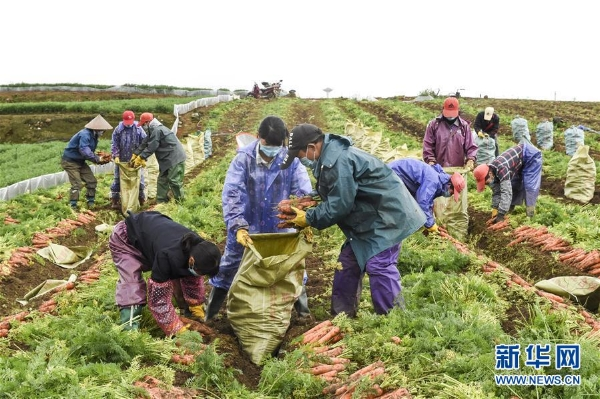 广西宾阳县王灵镇东湖社区村民在抢收胡萝卜,种植胡萝卜是当地的脱贫产业之一(2020年2月7日摄)图自新华社