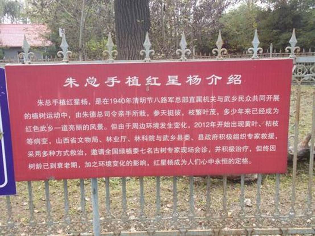 1939年到1940年,八路军总部转战驻扎在了太行山腹地的王家峪村。当时,不仅日寇常常对根据地进行扫荡,而且国民党政府也停止了给八路军的供给,并发动第一次反共高潮,我根据地处于日、伪、顽联合进攻的严重关头,根据地军民生活极其艰苦。就在这个时期,朱总司令坚定不移地带领敌后军民,坚持“前门打虎,后门拒狼",一面自卫反击,一面开展生产自救。朱总司令和广大战士们一样吃着野菜糊糊粥,穿着自织自染的土布衣裳,他们一边打仗,一边开荒种田。1940年清明节,总部机关和作战部队的战士们在蟠龙至下合村一线,开展了轰轰烈的植树运动,朱总司令也在百忙之中抽空来参加劳动,他来到王家峪的寨湾,手拿镢头,挖坑植树。此时此刻,他的心情非常沉重,过几天他就要离开生活战斗了两年半时间的太行山,准备到重庆与蒋介石就两军磨擦问题进行谈判,他想起了唐代诗人王昌龄的一首《从军行》“青海长云暗雪山,孤城滥望玉门关。黄沙历战穿金甲,不破楼兰终不还。”此行将会是何结局?他心中难以预料,想到这里,他决定在此留下一个永恒的纪念,于是把他珍藏了两年半的一颗红星拿出来,埋在树种的根下。