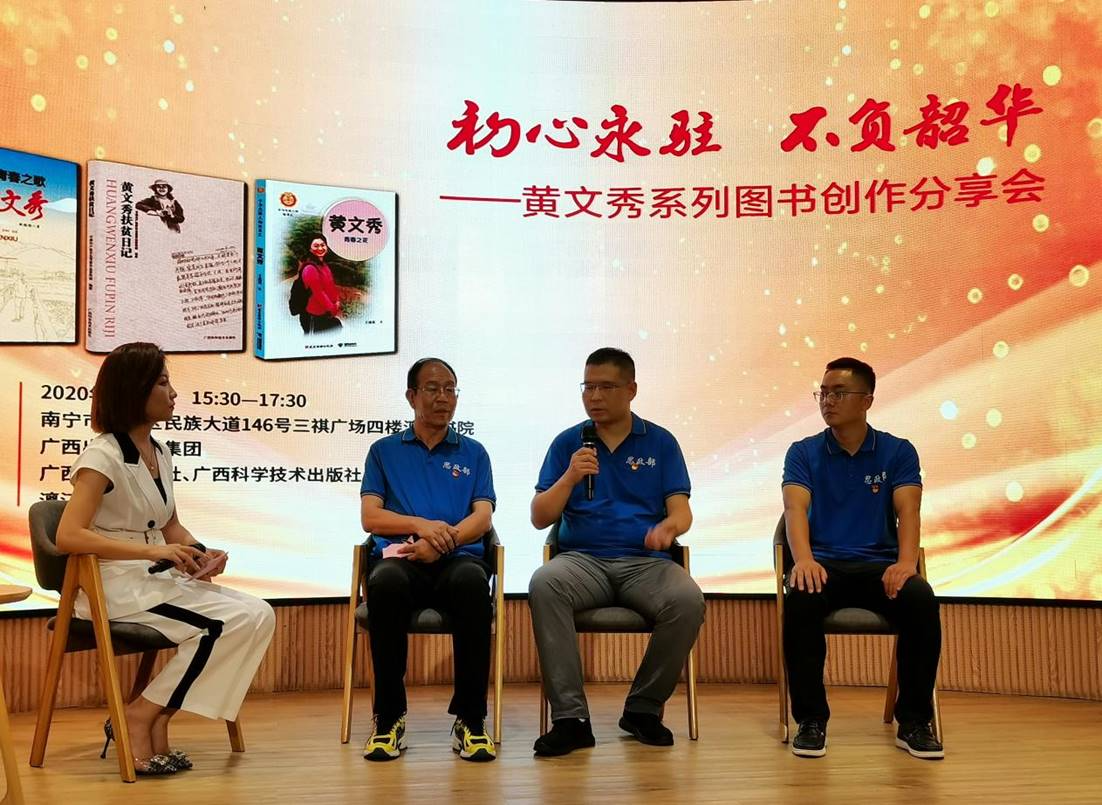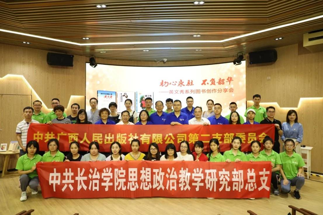 下午,黄文秀社会实践团队一行受邀在漓江书院参加广西出版传媒集团举办“初心永驻 不负韶华——黄文秀系列图书创作分享会”活动,活动现场,与会嘉宾分享了《新时代的青春之歌——黄文秀》《黄文秀扶贫日记》《黄文秀——青春之花》图书创作背后的故事,黄文秀实践团队表示图书生动再现黄文秀同志先进事迹,深受榜样鼓舞。在活动访谈环节,长治学院老师、文秀班的学生就黄文秀同志在长治学院、长治学院成立“黄文秀班”、向优秀共产党员黄文秀学习等进行分享。活动结束后,与会人员合影留念。