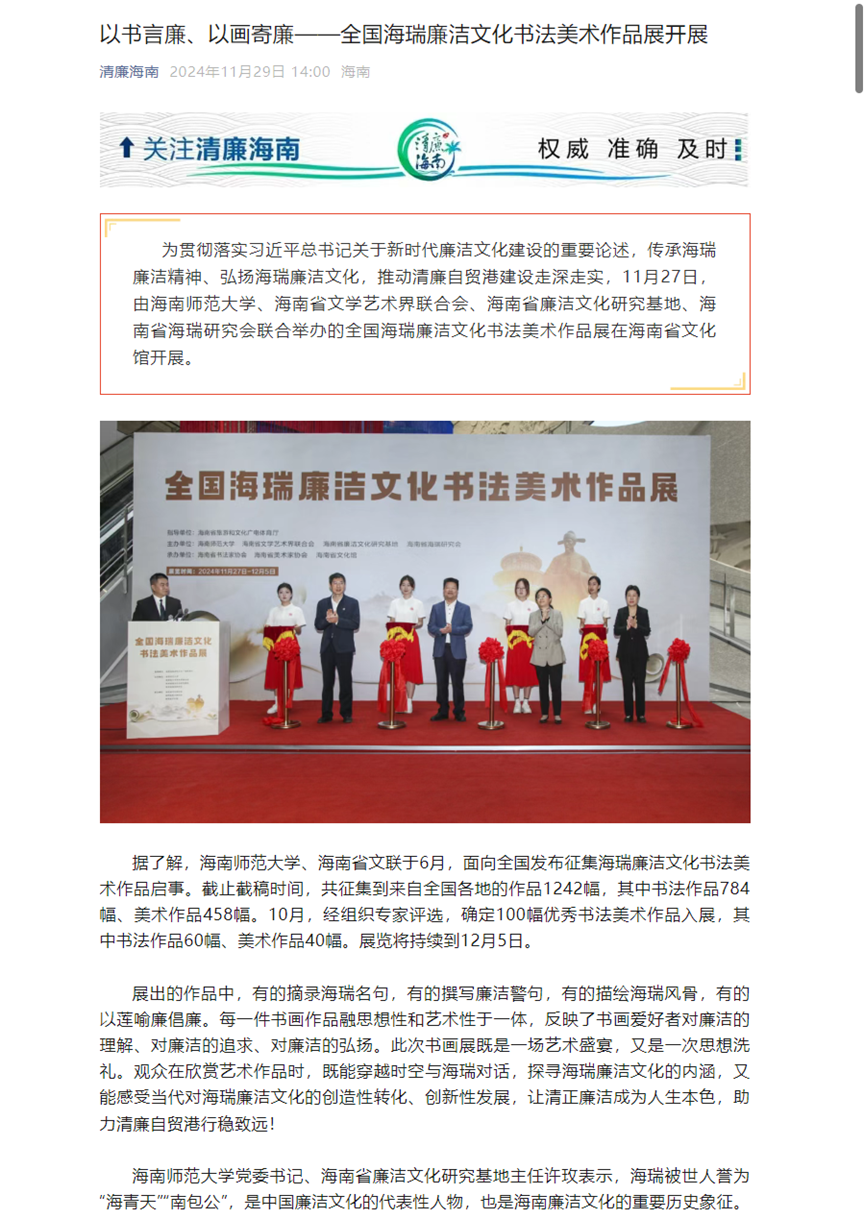 “海瑞廉洁文化”是海南师范大学着力打造的已经具有相当影响力的文化品牌。依托海南省廉洁文化研究基地、海南省学校党风廉政建设研究中心两个省级平台,连续举办“海瑞廉洁文化及其当代价值”全国学术研讨会,推动海瑞廉洁文化的理论研究,指导全省学校廉洁文化建设。与海南省广电总台联合制作15集《南海清风:海瑞廉洁文化谈》,出版《廉以齐家》等优秀普及读物,举办全国海瑞廉洁文化书法美术作品展,加强海瑞廉洁文化传播。学校廉洁文化建设报告获省主要领导肯定性批示,典型案例获海南省教育工委“清廉文化进校园”作品评选一等奖。