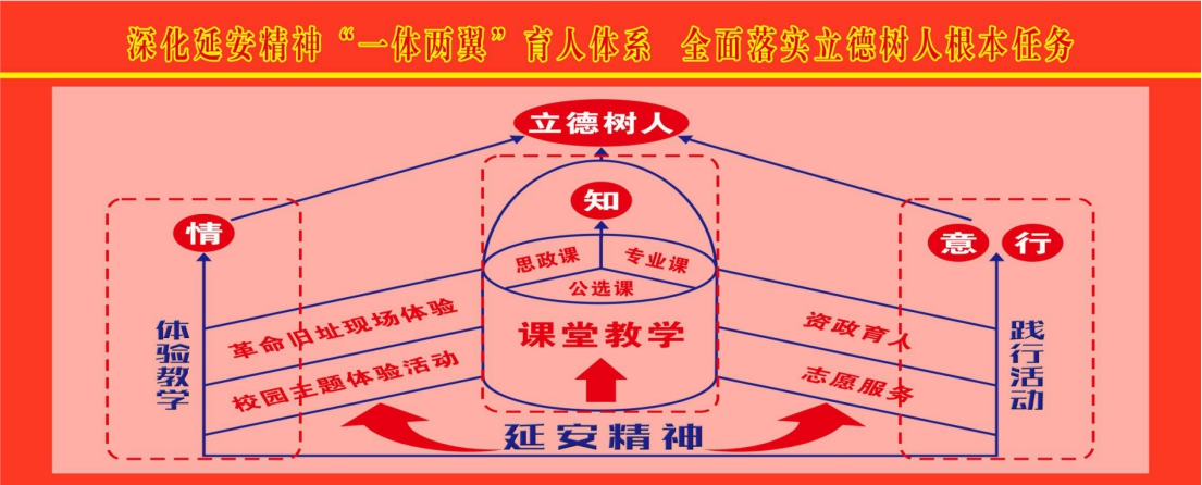 学校成立了延安精神教育领导和工作机构,出台了《延安精神“一体两翼”育人体系实施方案》《关于进一步加强大学生延安精神教育的实施方案》《延安大学“三全育人”工作实施方案》等制度机制,从教育引导、实践养成、制度保障等方面做出规划设计,从课程体系、体验教学、践行活动等环节提出教育要求,从学生入学到毕业各个环节制定工作流程,将延安精神教育贯穿到人才培养全过程、各方面。