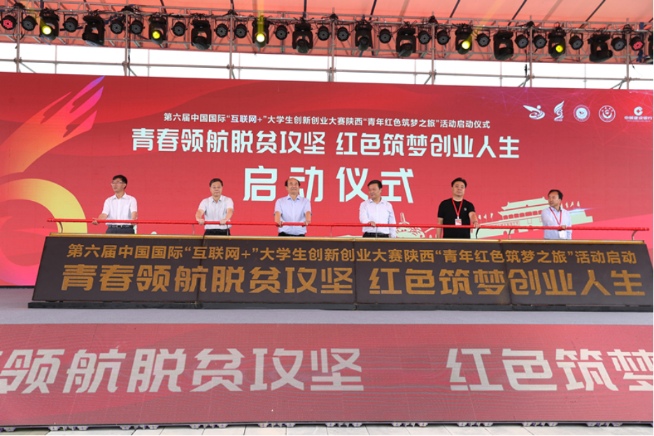 第六届中国国际“互联网+”大学生创新创业大赛陕西“青年红色筑梦之旅”活动参会领导和嘉宾共同推动流沙杆启动“青年红色筑梦之旅”活动