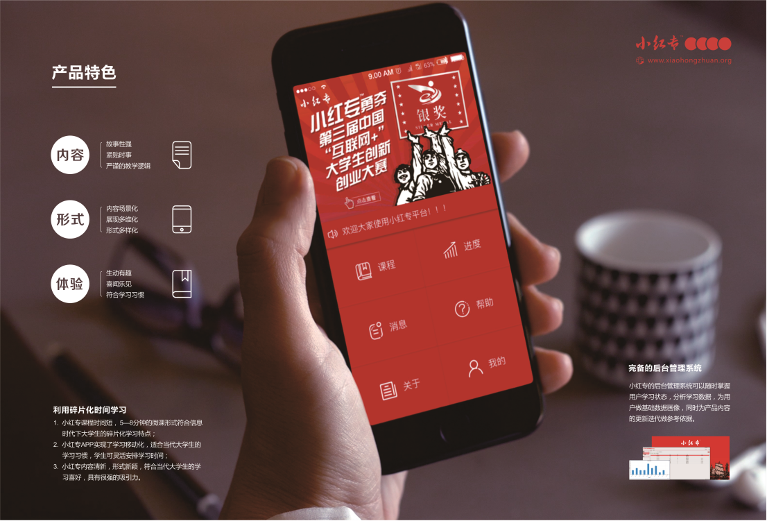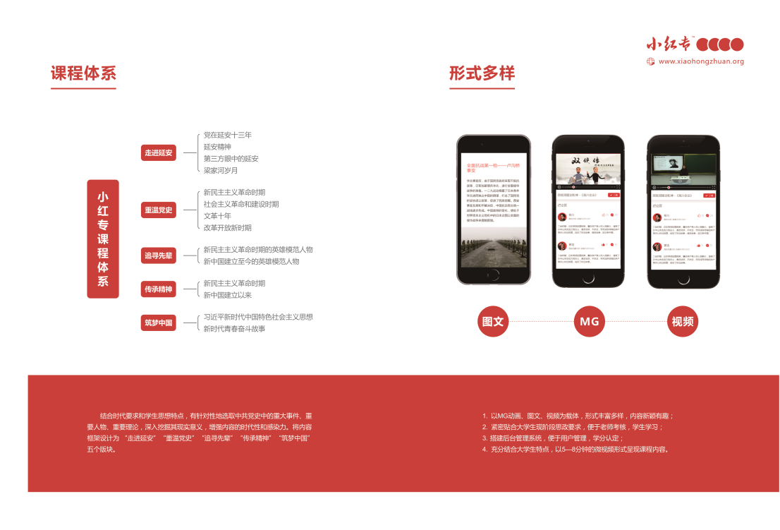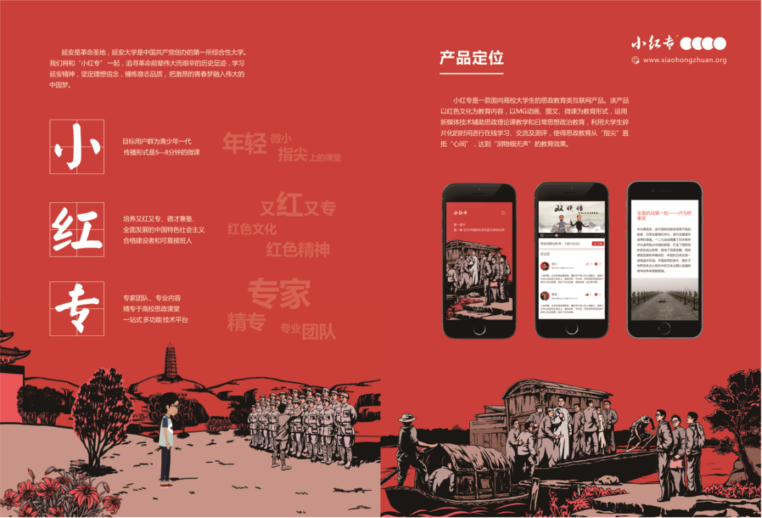 “小红专”是全国唯一一款对标大学生思想政治教育互联网APP产品,其以习近平新时代中国特色社会主义思想、党的十九大精神、梁家河知青岁月、中共党史为主要课程内容,通过5-8分钟的图文、音频、视频等方式进行课程呈现,并采用“一天一课,一课一考题”的学习考核新模式,充分利用了大学生碎片化时间完成了学考全过程,达到了润物细无声的效果,实现了思想政治教育从指间直抵心间的目标。(“小红专”名称说明:“小”是指它的目标用户群为青年大学生;课程短小精致易于传播;“红专”是指培养又红又专、德才兼备、全面发展的中国特色社会主义建设者和接班人。)