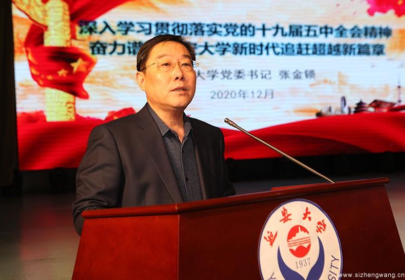 张金锁最后强调,党的十九届五中全会为延安大学奋进“十四五”提供了科学指引。全校党员干部和师生员工要以习近平新时代中国特色社会主义思想为指导,以习近平总书记重要批示精神统揽工作全局,深入学习贯彻十九届五中全会精神,紧扣立德树人根本任务,着眼新时代追赶超越新目标,紧盯强特色阶段发展新任务,坚持用延安精神铸魂育人,坚持深化改革创新,抢抓机遇、真抓实干,奋力谱写延安大学新时代追赶超越新篇章。
