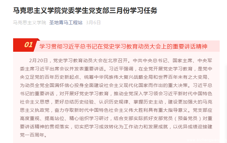 ——党委先学先行,统一安排部署。2月28日下午,马克思主义学院党委常务副书记兼副院长张彬主持学院党委理论中心组进行专题理论学习会议,传达了中共中央印发的《关于在全党开展党史学习教育的通知》,领学了习近平总书记在党史学习教育动员大会上的重要讲话精神,中心组成员结合自身思想认识和工作实际交流了学习体会。随后,学院党委经过讨论,统一安排部署了以“小马颂党恩”为主题的系列活动,此外,学院党委还为学院教工、学生党支部党员配发了习近平《论中国共产党历史》一书。