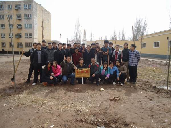 (图1:2012年3月,我们山东理工大学的3名教师和30名支教学生在新疆喀什八一中学种下了“支教林”,希望泰山天山心手相牵,为教育的天空增添一片新绿。)