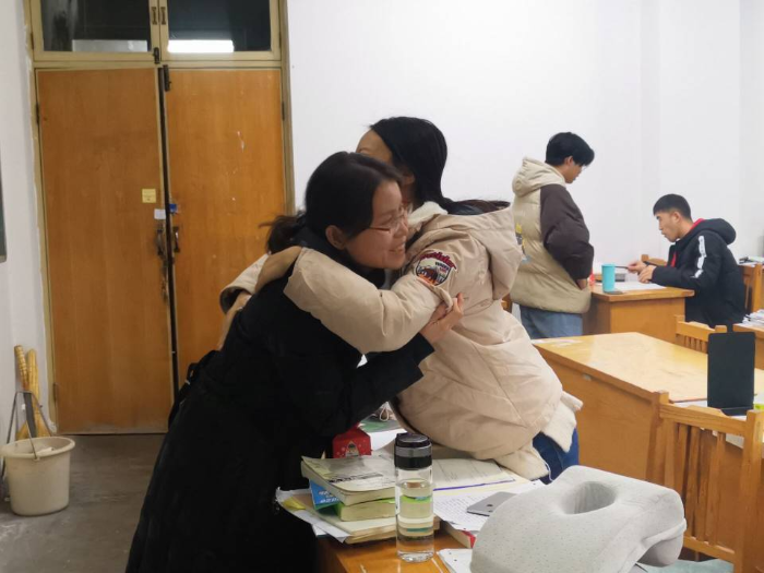 (图3:2019年冬天,离2016级研究生考试前一周,我走进教室,与学生们一一握手、拥抱,给他们以心理安慰。)
