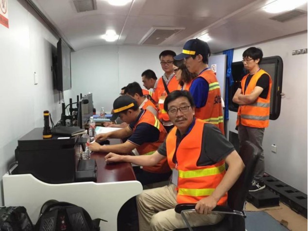 图为高仕斌在高铁天窗时间跟随4C接触网检测车分析检测数据