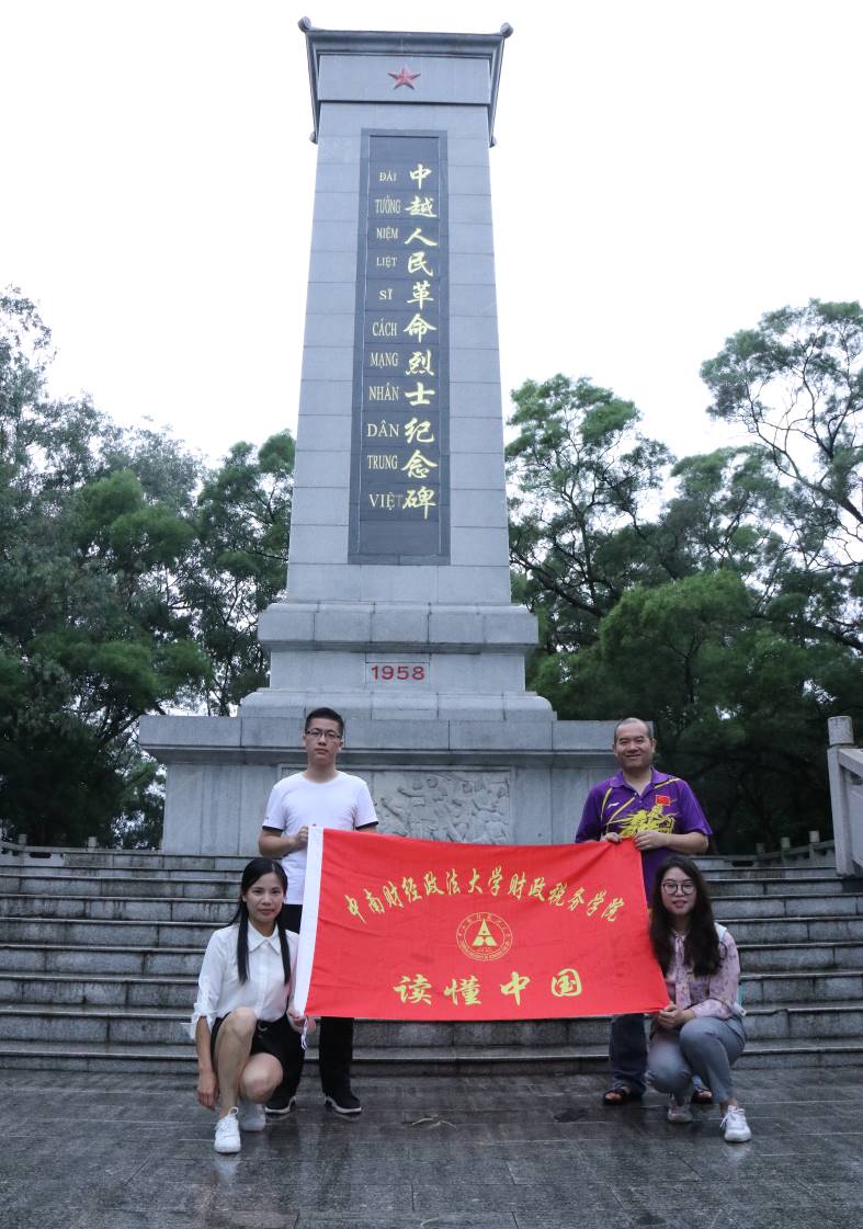 雨纷纷,烈士魂。到达防城港市的第二天,蒙蒙细雨中,“双基地”建设广西分队首先来到位于中越界河北仑河附近的中越人民友谊纪念公园,缅怀革命先烈。“青山有幸埋忠骨,何须马革裹尸还”,队员们缓步绕行纪念碑以示悼念。纪念碑左侧,还矗立着一座防城县第一个中国共产党支部的纪念碑。中共防城县第一任党支部书记钟竹筠同志在大革命时期积极领导革命运动,后被敌人秘密逮捕,在狱中坚贞不屈,最后在北部湾刑场英勇就义,年仅26岁。师生在痛惜与哀悼之后,表示难忘烈士英魂,要传承红色精神。