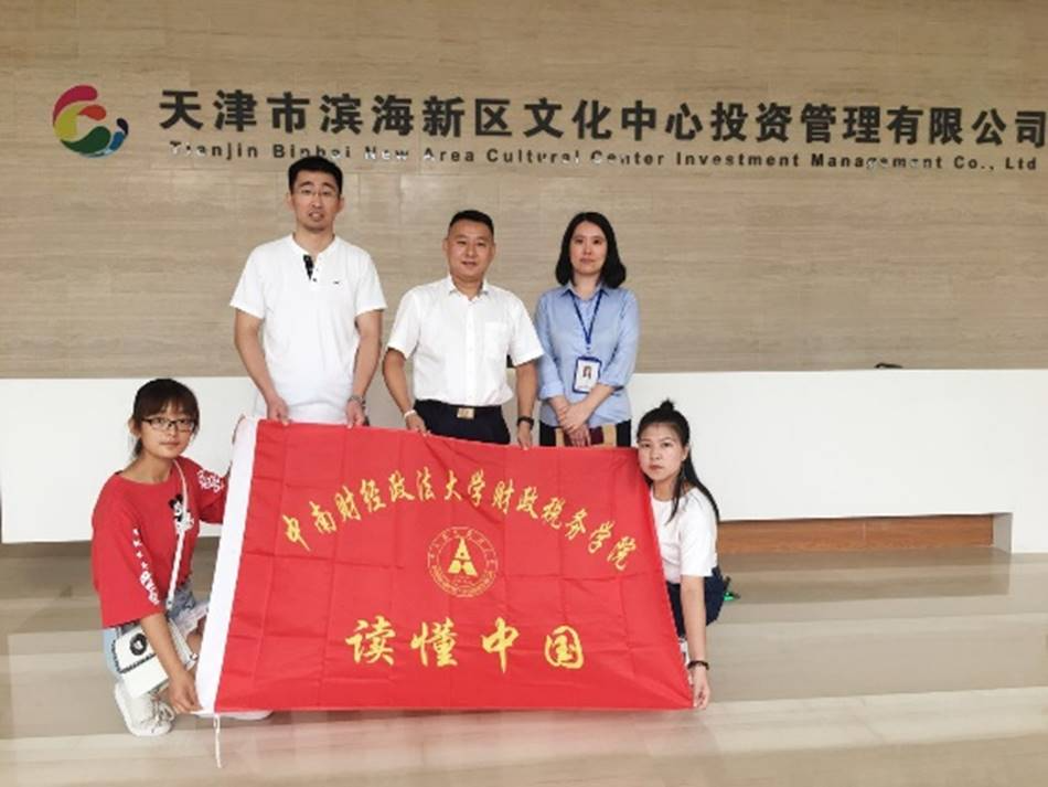 2018年8月10日上午,“北京、天津实践队”来到天津滨海文化中心拜访高治国董事长及相关负责人。会谈开始,张老师详细介绍了中南财经政法大学财政税务学院近年的发展历程、教学理念和目标,还着重介绍了“读懂中国——新时代青年党性培养质量工程”的具体情况及其社会影响。高治国董事长听后表示非常关心中南财经政法大学的发展,非常认可学院的活动理念,愿意提供支持,来助力活动顺利完成。他叮嘱中南大学子未来学习中以只争朝夕、时不我待的精神严格要求自己,珍惜大学时光,双方共同期待双基地的建设将成为两方加强沟通联系的桥梁和纽带。