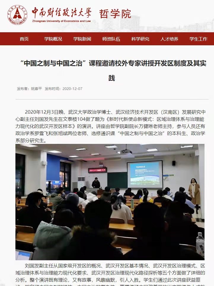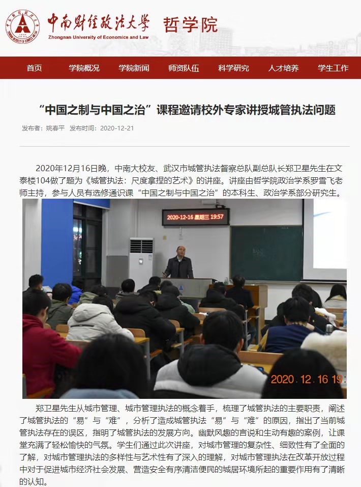 课程教学弥合严谨理论分析与时政要闻追踪之间的分野,采用系列专家讲座形式,邀请学有专长的学者以及来自政府部门的实务精英走进课堂。课程组设计了“中国能力——抗疫背后的中国之制与中国之治 ”“治大国:中国共产党的治理之道”“中西文化比较视野中的中国之制”“中西文化比较视野中的中国之治”“中国语境下的公共治理方式及其有效性”“大国政治与大国外交”等多个富有特色的教学专题;并邀请武汉经济技术开发区(汉南区)发展研究中心副主任刘国发、武汉市城管执法督察总队副总队长郑卫星分别以《新时代新使命新模式:区域治理体系与治理能力现代化的武汉开发区样本》、《城管执法:尺度拿捏的艺术》为题从基层工作视角向学生讲述中国之治的真实故事,展现中国之制的制度优势和中国之治的实践智慧,引导学生理解中国特色社会主义制度优势转化为国家治理效能的机制和逻辑。