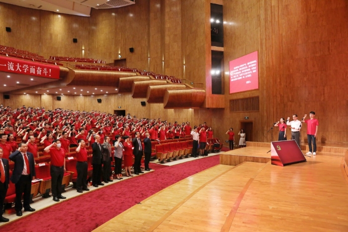 在北京大学常务副校长龚旗煌的带领下,新党员进行入党宣誓,老党员重温入党誓词。“我志愿加入中国共产党……为共产主义奋斗终身,随时准备为党和人民牺牲一切,永不叛党。”铿锵有力的誓言久久回荡,回荡在燕园的每一个院系部门,回荡在每一个北大共产党员的心中。