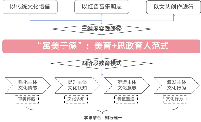 充分发挥美育在审美、铸魂、践行方面的优势,三维度四阶段构建美育+思政的育人范式:以传统文化增信,以红色音乐明志,以文艺创作践行的三维度实践路径,和强化主体文化情感,提升主体文化认知,塑造主体文化意志,激发主体文化行为的四阶段教育模式,引导学生从审美体验-文化认知-价值塑造-文化行为,在美的浸润中达成学思结合、知行统一、健康成长。