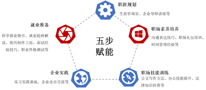 “职”点迷津求职训练营通过“五步赋能”为不同阶段的学生提供全年全程式就业服务。通过设置不同主题的生涯规划讲座、职场能力培训、专业生涯咨询、对口单位实习实践等活动,“早谋划、早部署、早行动”,增强职业探索、提升专业技能、培养奉献精神和实干精神。