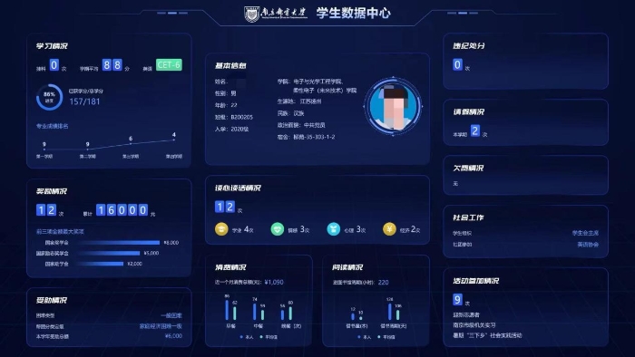 南京邮电大学为科学研判学生成长发展规律和发展需求,着手构建“一站式”学生数智生态,实现精准决策、精准管理、精准思政、精准供给。一是精准把握学生思想动态。通过对学生网络行为进行信息收集、深度挖掘以及聚类分析等,精准掌握学生的思想动态和关注的热点话题,做到“精准化”思政引导,同时注重数据的安全性和隐私保护,确保学生的合法权益不受侵犯。二是构建“立体式”学生画像。通过校园消费、宿舍管理、学业成绩、奖助情况、实践情况、图书借阅等多维度信息测算,探索构建“立体式”学生画像,实时把握学生动态,形成智能预警机制,实现精准管理,帮助精准决策。三是深化平安社区建设。通过构建网络安全体系,持续打造“南邮慧盾”,发挥信息系统的数据采集分析效能,加强运行状态监测,维护社区网络安全,提升学生安全感与幸福感。