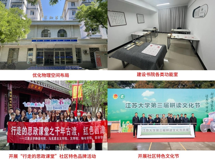 学校因地制宜,不断优化社区物理空间布局,建成党团活动室、心理咨询室、图书资料室等公共空间,打造温馨和谐便利的社区环境,实现学生浸润式成长。打造“一书院、一主题、一品牌”,形成具有“红特色”“学氛围”“家文化”的特色样板书院;制定书院特色院标、院训,加强社区主题文化墙、主题场景等文化场域建设,社区文化内涵不断丰富,学生情感教育、精神激励和价值观塑造不断强化。开展“社区文化节”“江心‘悦’伴”“我在江大种草药”等主题文化活动,打造“每月一主题、月月有活动”育人品牌项目,营造沉浸式文化活动体验。开设“社区大讲堂”“松秀讲堂”“行走的思政讲堂”《江苏大学报》书院专栏、“社区广播站”微信公众号专栏等平台,月度编发“一站式”学生社区工作简报,推动各类文化元素为社区建设增动能增成效、为社区建设增内涵添魅力、为社区育人增正气添活力。
