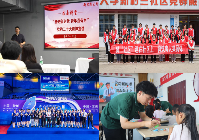 用工匠精神培育与感恩知责教育双轮联动学校文化引领社区文化建设,营造“德行天下、匠心逐梦”沉浸式社区育人氛围。构建主题党课、团课、班会课价值引领体系,办好开学典礼、毕业典礼,讲好“开学第一课”“毕业最后一课”,开设“求是讲堂”150余场,“以大师引领未来大师行动”20场,“杰出校友领航未来校友行动”8场,打造“求是·常工业”思政大课品牌。将“社区”建在“社区”上,组织“社彩缤纷”精品社团活动81场,“锋华正茂”志愿服务活动88次,“强国有我 青春有为”主题社会实践活动59次,形成学生社区、学生社团、社会实践“三社联动”的生动局面。获评全国大学生艺术展演美育案例二等奖、省“高校百校万名团干部思政技能大比武”特等奖、省高校红十字“博爱青春”项目金奖、江苏青年志愿服务项目大赛一等奖,江苏高校网络思政“金微课”征集遴选“一站式”学生社区建设项目二等奖。
