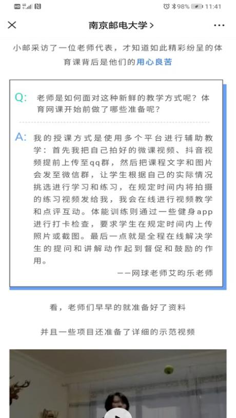 同时,艾老师通过发在学生群内的问卷调查,发现学生们更希望看到自己熟悉的老师拍摄的视频进行学习,学习效果更好。于是,艾老师专门进行了拍摄教学视频,自行进行剪辑,创建了每天一分钟学习网球的视频,与学生们进行分享网球知识点和体能训练方法,受到一致好评。很快,艾老师的视频在网络平台上被南京体育广播转发并受邀做客了南京体育广播103.4FM《运动处方》节目,聊健康养身、运动训练方法等,与大家分享运动抗疫,增强身体素质,居家抗疫,体育先行,同舟共济,运动战疫,展现了当代体育人“使命在肩、奋斗有我”的高尚情操。