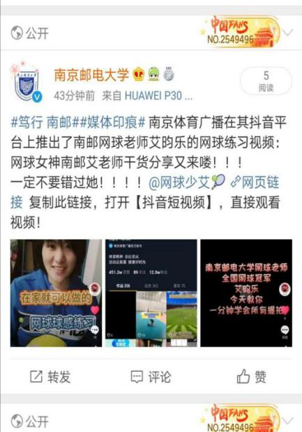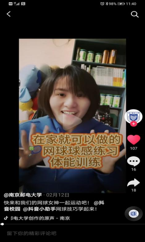 南京邮电大学体育部党总支的网球老师艾昀乐,在疫情期间积极主动开展创新形式的线上课程,用网球接力,用运动抗疫,用锻炼身体,坚持运动,来支持中国,支持武汉,得到广大师生的一致好评,通过学校官方平台宣传,被南京体育广播官方媒体抖音号持续发布视频课程。