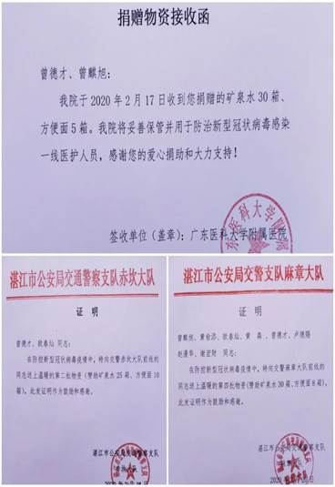 Ø 疫情面前,人人都是战士。在当前疫情防控的关键时期,继续教育学院学生会副主席、18级室内设计班学生曾德才号召身边的朋友,共同为抗击疫情贡献一份自己的力量:于2月14日向湛江市公安局交警支队赤坎大队捐赠矿泉水25箱、方便面10箱;2月17日,向广东医科大学附属医院捐赠矿泉水30箱、方便面5箱;2月20日,向湛江市公安局交警支队麻章大队捐赠矿泉水30箱、方便面8箱。他表示,献一份爱心,担一份责任,从每个人做起,共同为全面打赢疫情防控阻击战提供坚强的后盾。