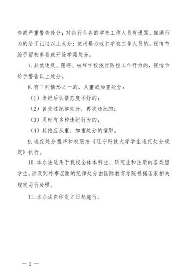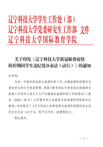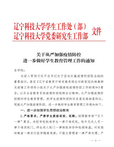 3月2日,为准确掌握学生的具体情况,更好的开展疫情防控工作,学生工作处(部)联合党委研究生工作部组织各学院对全校暂居国外的中国学生进行了摸排,并通知各学院密切关注暂居国外的中国学生的身体状况等情况,加强对学生的关心,及时向学生传达学校开学时间,多与学生进行沟通,全面了解学生行程等信息并及时上报。3月23日,为进一步做好学校暂居国外学生疫情防控工作,及时准确掌握学生信息,有效应对疫情输入风险,切实保障学生身体健康,学生工作处(部)再次部署对暂居国外学生疫情防控相关工作:一是深入排查,准确掌握学生暂居国外情况;二是密切关注,及时了解学生身体健康情况;三是教育引导,关心学生暂居国外生活情况;四是及时沟通,提醒学生回国相关注意事项。4月10日,为深入贯彻《国务院应对新型冠状病毒感染肺炎疫情联防联控机制关于印发新冠病毒无症状感染者管理规范的通知》精神,严格实施“外防输入、内防反弹”防控策略,学生工作处(部)联合党委研究生工作部组织各学院在全校范围内对无症状感染者进行排查,要求各学院:一是深入排查,及时掌握学生身体健康情况。二是教育引导,加大新冠肺炎防控知识科普宣传力度。三是慎终如始,持续做好“日报告”“零报告”工作。由于黑龙江省确诊病例、无症状感染者持续增加,疫情防控工作面临复杂严峻的形势,为进一步做好疫情防控工作,及时有效掌握学生信息,降低疫情传播风险,避免聚集性疫情发生,切实保障学生身体健康,4月18日,学生工作处(部)发布《关于进一步了解关心黑龙江省学生健康状况的通知》,要求学院在深入排查,准确掌握学生健康状况及目前所在地信息的基础上,积极做好教育引导工作,全面关心学生及家人生活状况。4月27日,按照《辽宁省教育厅办公室关于做好普通高等学校师生健康状况和旅居史调查工作的通知》《辽宁科技大学师生健康状况和旅居史调查工作方案》文件要求,学生工作处(部)联合党委研究生工作部在全校学生范围内开展健康状况和旅居史调查工作,对全校学生近30日出行轨迹和健康状况进行详细调查,除学生身体状况外,特别筛查近期有无境外及境内疫情严重地区(暂定为湖北省和黑龙江省)旅居史情况,接触来自境外人员或境内疫情严重地区人员情况,以及接触确诊、疑似病例或无症状感染者等情况,实现全校学生调查覆盖无遗漏。5月18日,随着吉林省疫情发展形势,学生工作处(部)联合党委研究生工作部对5月1日以来有吉林省旅居史和接触史的学生进行排查。6月中旬,随着北京市连续出现新增确诊病例,学生工作处(部)联合党委研究生工作部发布《关于加强重点地区学生疫情防控工作的通知》《关于严防域外(北京)疫情输入工作的通知》,要求各学院要对目前在北京市居住的学生、5月30日以来由北京市返辽来辽的学生进行深入排查。
