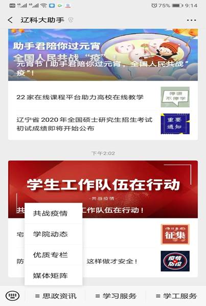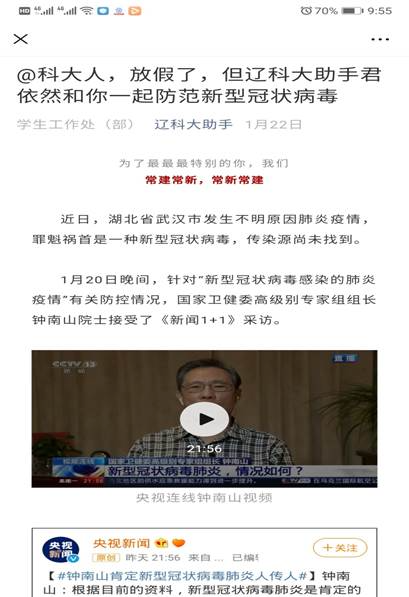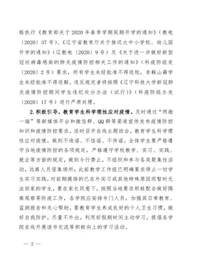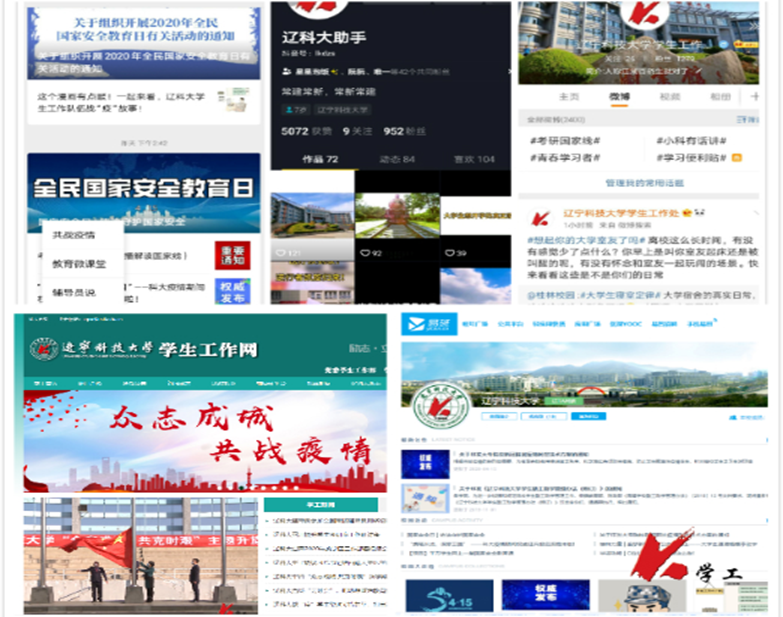 开展疫情防控工作以来,学生工作处(部)通过“辽科大助手”平台连续推送《面对疫情不恐慌 做好防护最重要》等100余篇文章,对广大学生积极开展宣传教育;利用工作群、班级群、家长群转发各类防控知识及相关文件,及时向学生宣传普及疫情防控知识和相关要求;推送《共战疫情|辅导员有话对你说》专题,通过辅导员发声,教育引导学生积极面对疫情。通过易班工作站开展“爱的接力,加油武汉”、“我是科大人,我承诺”等专题活动,助力疫情防控,做好舆论引导,积极传递正能量。2月13日,制定了《辽宁科技大学学生抗击新冠肺炎疫情个人承诺书》,明确列出坚定信心、抵制谣言,遵守规定、提高意识,科学防护、争做表率,服从安排、保持联系,及时报告、杜绝隐瞒,合理规划、居家学习等六个方面内容,对学生再一次教育提醒。
