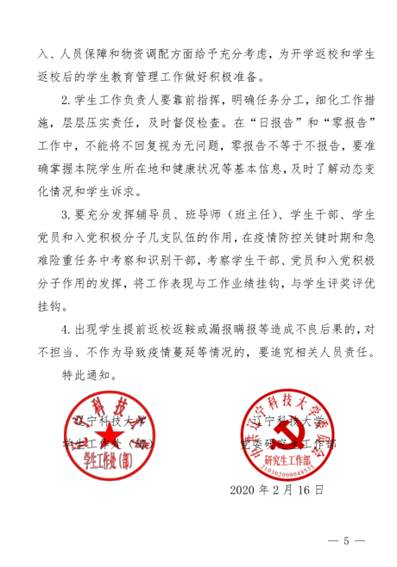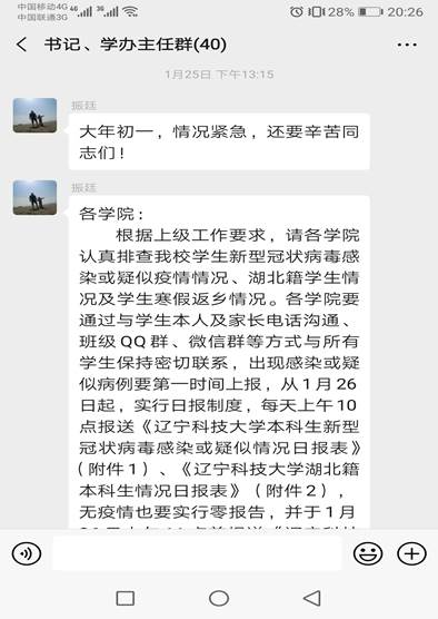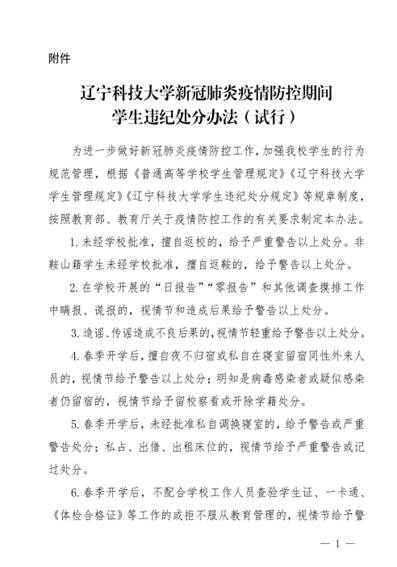 1月25日,除按鞍山市要求上报有关数据外,学生工作处(部)还制定了《辽宁科技大学本科生新型冠状病毒感染或疑似情况日报表》《辽宁科技大学湖北籍本科生情况日报表》和《辽宁科技大学本科生寒假返乡情况统计表》,按照要求详细排查了在疫区学生、经过疫区返乡学生情况。工作过程中注重对湖北籍学生加强人文关怀,保护好隐私信息。1月26日起,学校全体学生全面实行“日报告”和“零报告”制度。1月30日,学生工作处(部)组织各学院排查人民日报《196车次 航班发现患者 急需同行人》,排查本科生中是否有学生乘坐涉及车次、航班,将排查任务落实到人,并做好登记。2月1日,为更好掌握学生健康情况,将湖北籍学生家人的健康状况纳入湖北籍学生的日报统计内容,每日排查湖北籍学生及家人健康状况,如有异常及时上报,提醒各学院要继续高度重视,防止松懈大意、漏报瞒报。2月11日,下发了《关于摸排和日报学生居住地点的通知》,积极建立未返校学生“人盯人”管理体系,要求各学院全面摸清、准确掌握学生所在地信息和健康状况,并对学生未在家庭所在地情况和原因进行详细排查梳理,按照探亲、入伍、实习、打工、跟随父母到打工地、因疫情未回家等原因对821名学生进行了分类,要求各学院切实做到“人盯人”,建立台账,跟踪了解学生所在地变化情况和健康状况。针对个别独自在外的学生,各学院领导班子积极研究落实“人盯人”制度,一一电话沟通,及时给予生活关心和心理疏导。2月16日,根据鞍山市《关于对高力房镇实施封闭式管理的通告》,为全面掌握学生相关信息,学生工作处(部)立即组织各学院对目前在台安县高力房镇居住的7名本科生进行排查。在掌握了学生基本情况后,叮嘱学生近期要特别注意防护疫情,不要外出,有异常情况第一时间与学校进行联系。2月16日,学生工作处(部)与党委研究生工作部联合印发《关于从严加强疫情防控进一步做好学生教育管理工作的通知》《辽宁科技大学新冠肺炎疫情防控期间学生违纪处分办法(试行)》,要求各学院从严加强疫情防控期间学生教育管理,把学生疫情防控的任务落实落细落到位。
