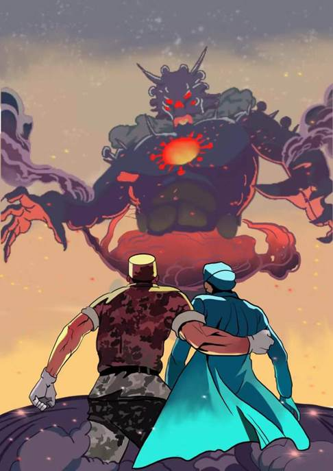 贾涵宇创作的绘画《医护人员齐上阵,四面八方同支援》