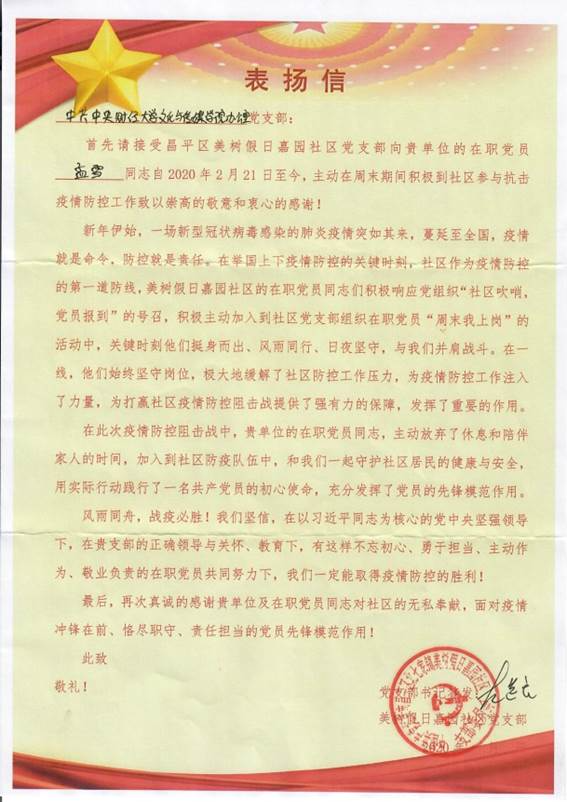 财经文秘17级预备党员周玥同学在疫情期间于北京市怀柔区参与雁栖镇范各庄门卫巡查岗志愿活动3次,负责出入社区人员检查、登记人员出入证、车辆出入证、外来访客登记表、返(来)京人员登记表、对出入社区人员进行体温监测、快递物品消毒等工作。