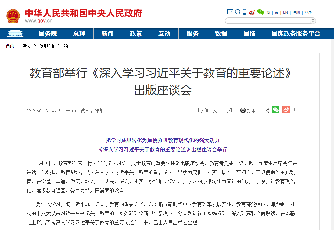 中央政府网:《深入学习习近平关于教育的重要论述》出版座谈会举行