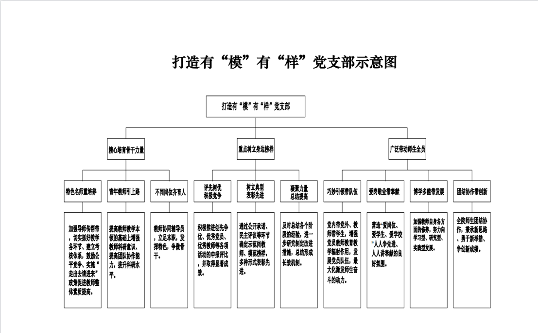 河南理工大学土木工程学院力学系党支部从党建、教学、科研等工作实践中,总结凝练形成了可推广、可复制、可借鉴、可操作,具有广泛辐射效应的党建工作品牌——有“模”有“样”党支部。具体做法是:通过培育骨干力量,促进教师素质提高,实现支部有模范;通过选树身边榜样,激发教师奋进热情,做好模范传帮带;通过落实“七个有力”,培养党员担当作为,打造样板党支部;通过利用“辐射效应”,创新党建工作方法,发挥样板支部正能量。