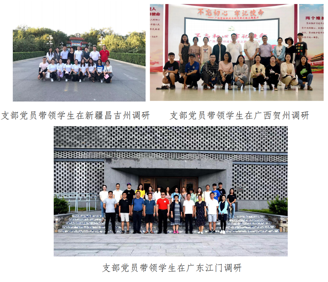 此外,由支部党员牵头在黑龙江牡丹江市、四川雅安市、新疆昌吉州、贵州黔南州、广西钦州市、广西钟山县、广东江门等边疆和少数民族地区建立社会实践调研基地7个,开展民族团结进步和民族团结教育相关课题研究,带领学生到实践基地开展实践教学,为当地政7府等民族团结进步政策的制定和实施建言献策,形成的社会实践报告获评首都高校思想政治教育社会实践优秀调研报告。支部党员孙英、杨宗丽等同志多次在社会实践基地为地方党委中心组学习授课,为少数民族地区干部队伍培养添砖加瓦。